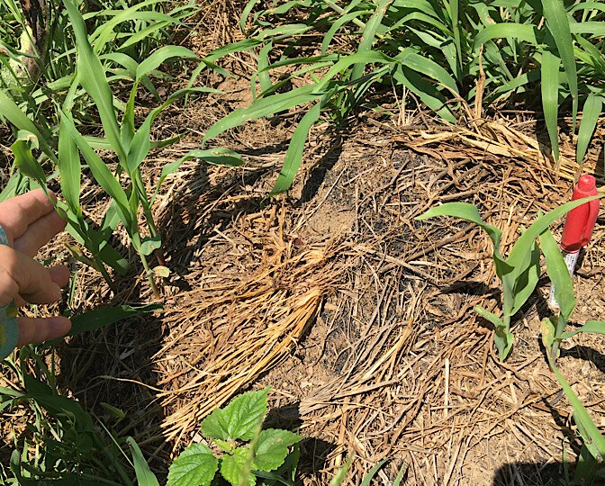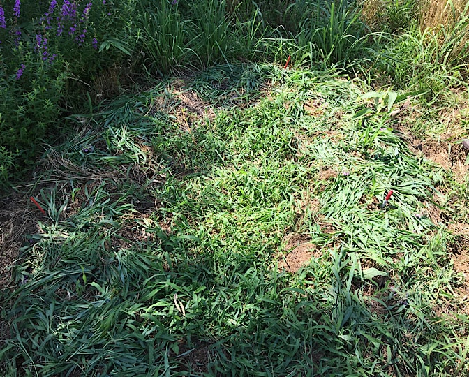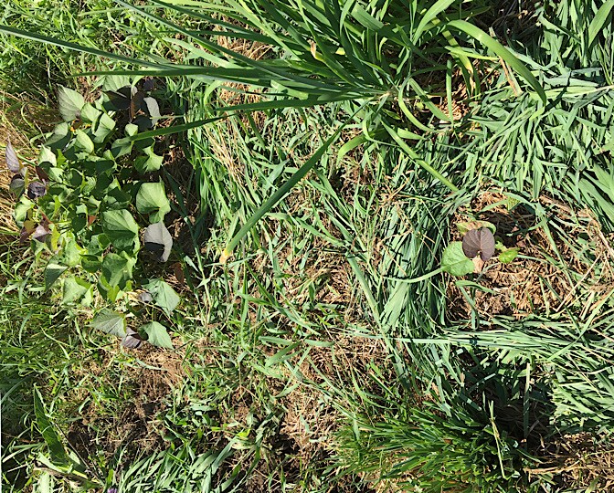 畝の中は地際で草刈り、通路はスポーツ刈り(5cmくらい残して刈る)、畝周りは15cmくらいの高さで草刈りしました。