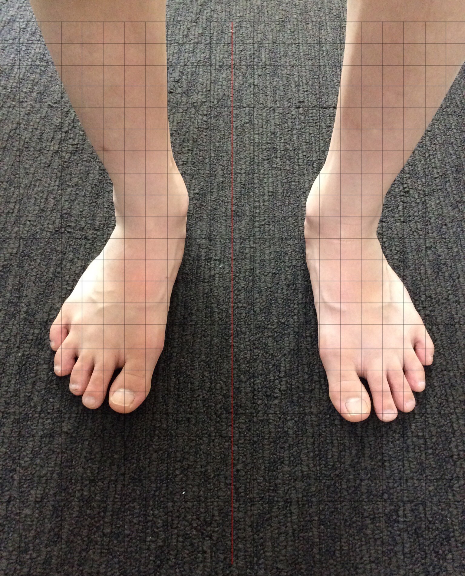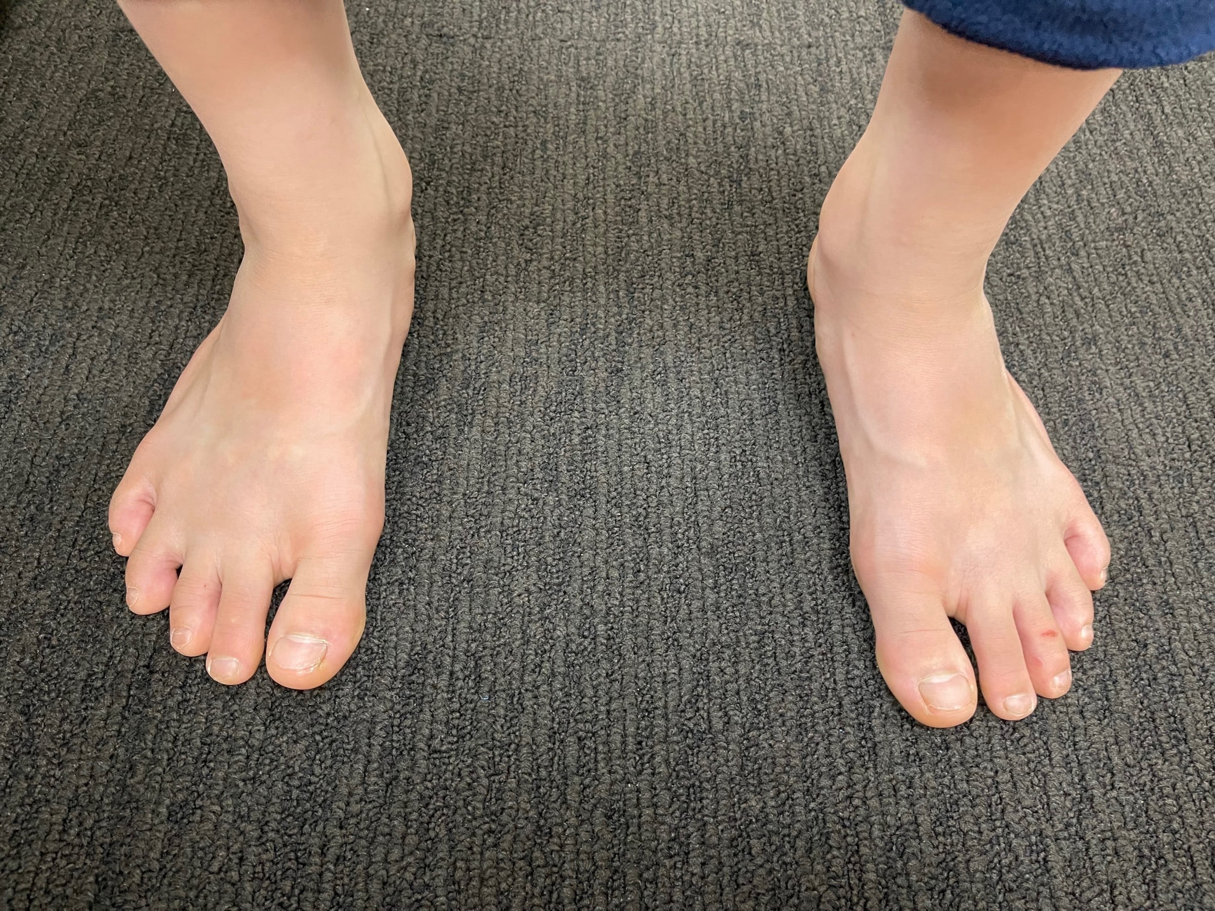 この学生は部活で柔道をしているが、練習中に腰が痛むとのことでしたので足をチェックしたところ、足首が内側に入ってしまう過回内と言う状態にありました。