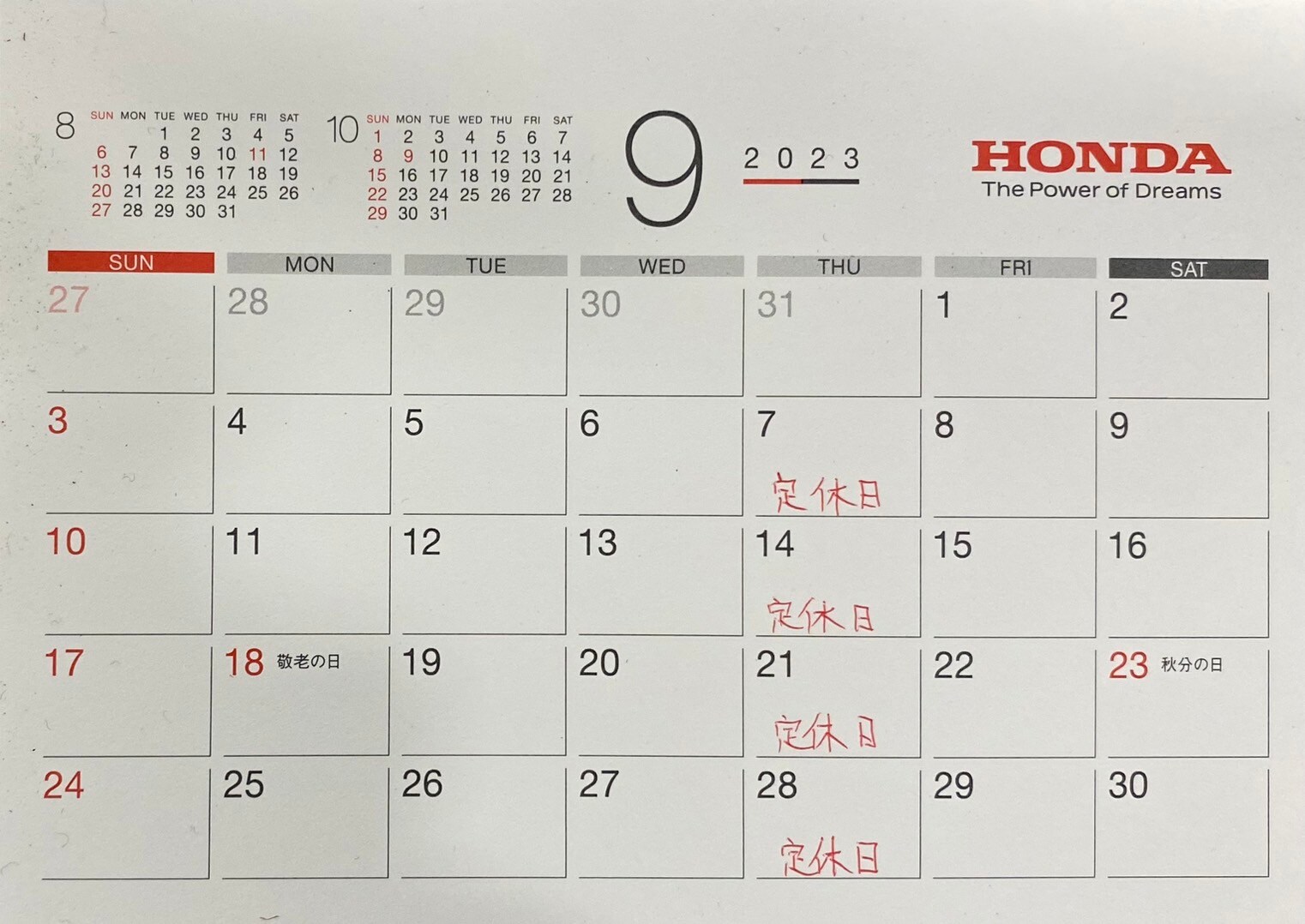 9月の定休日
