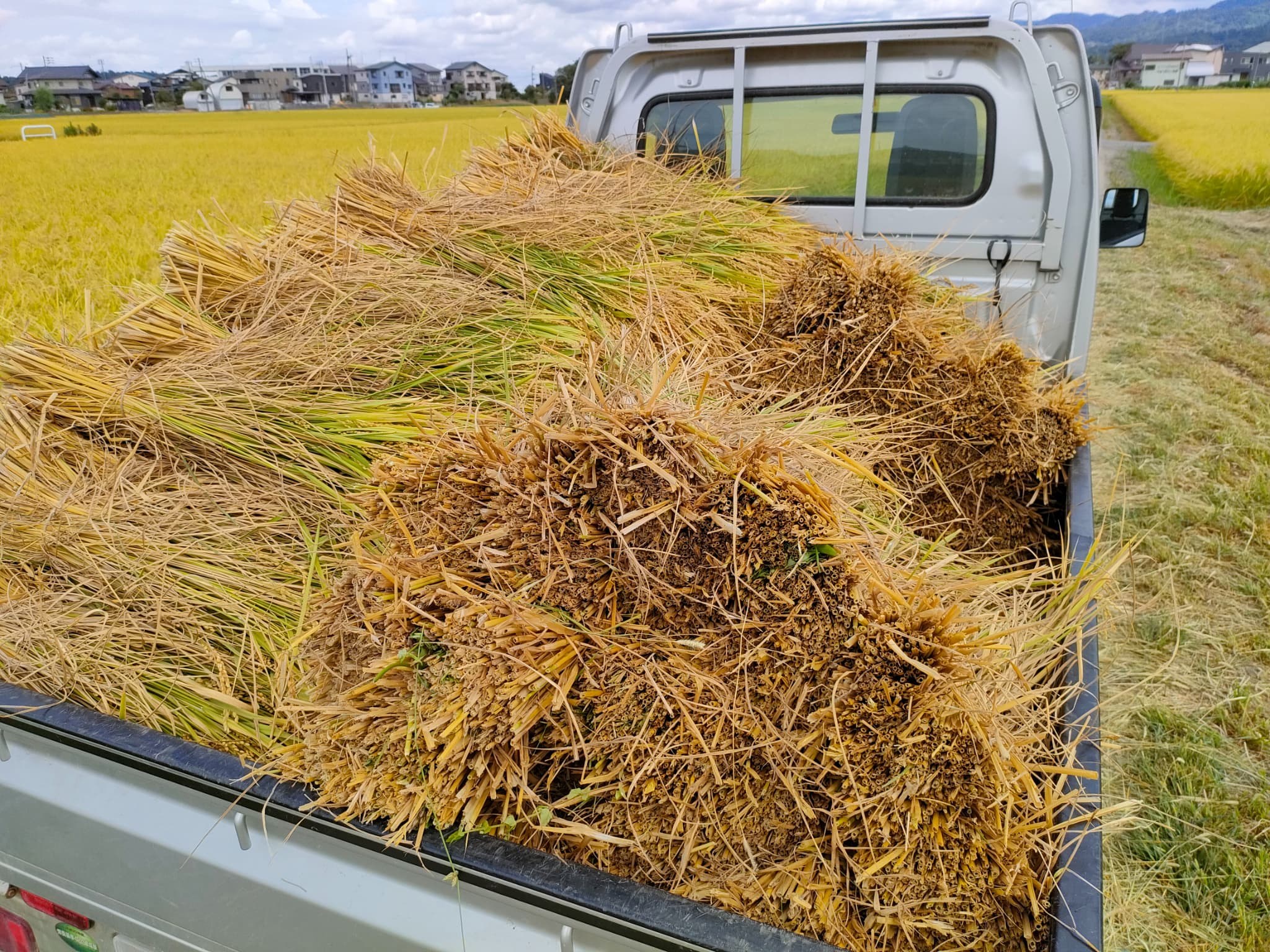 軽トラに積み込んだ稲束の山。