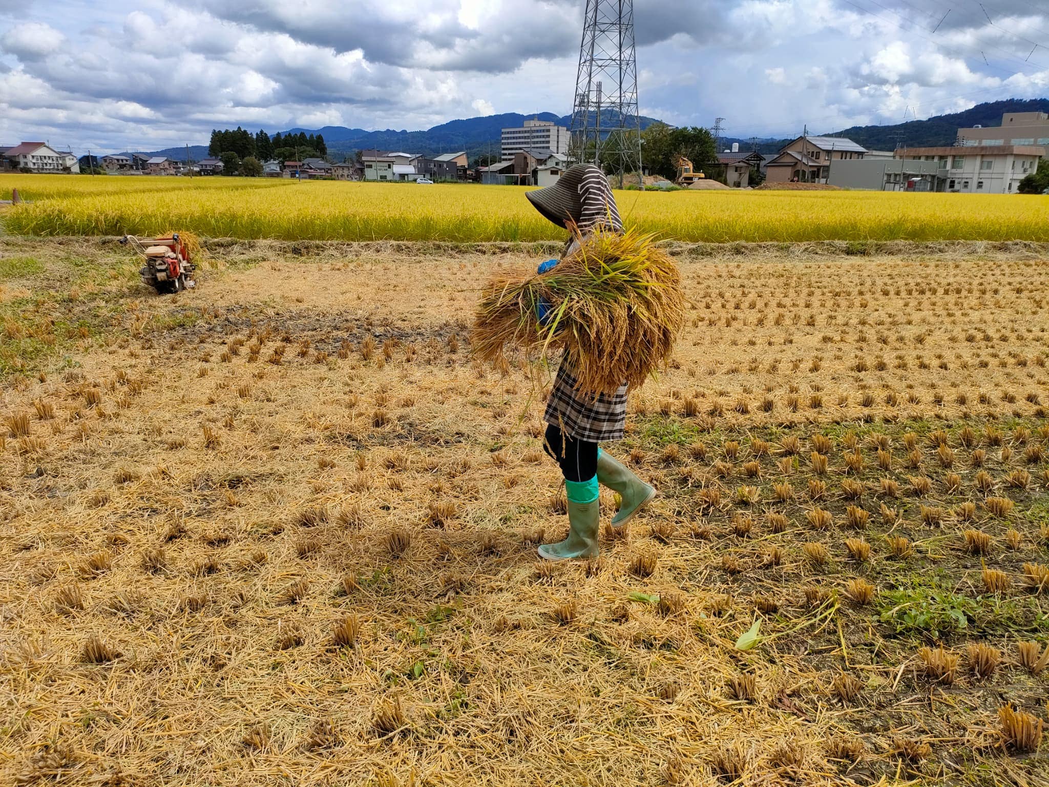 稲束を集めて運ぶ母!