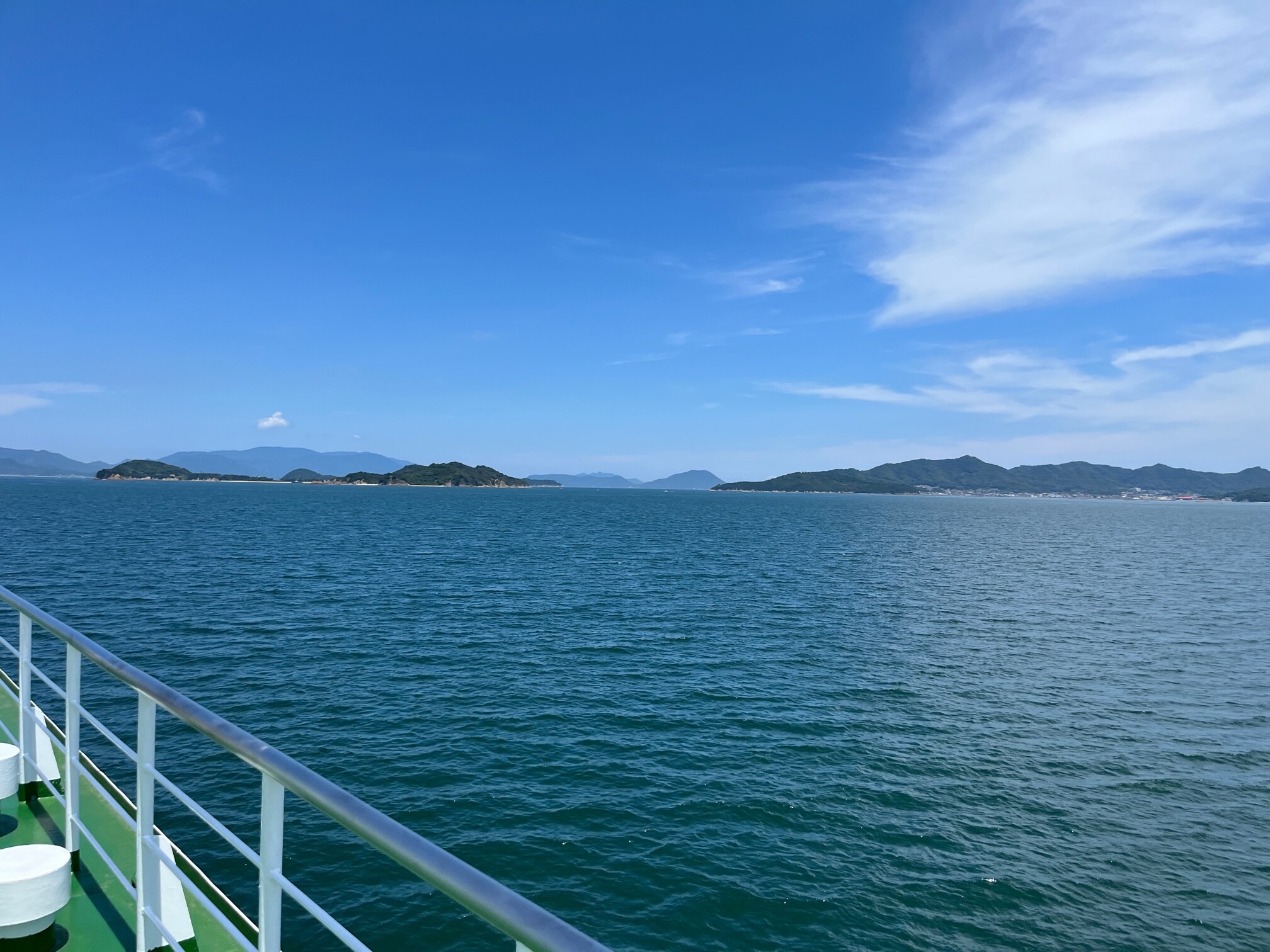 高松港よりフェリー。瀬戸内海の島々。波が穏やかです。