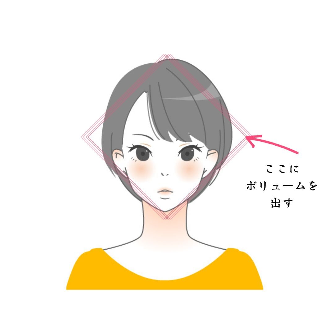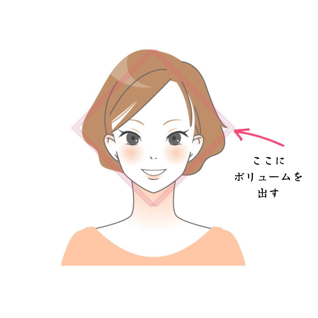 ショートヘアの場合、上記のイラスト、顔のところに『ひし形』の枠をつけています。
