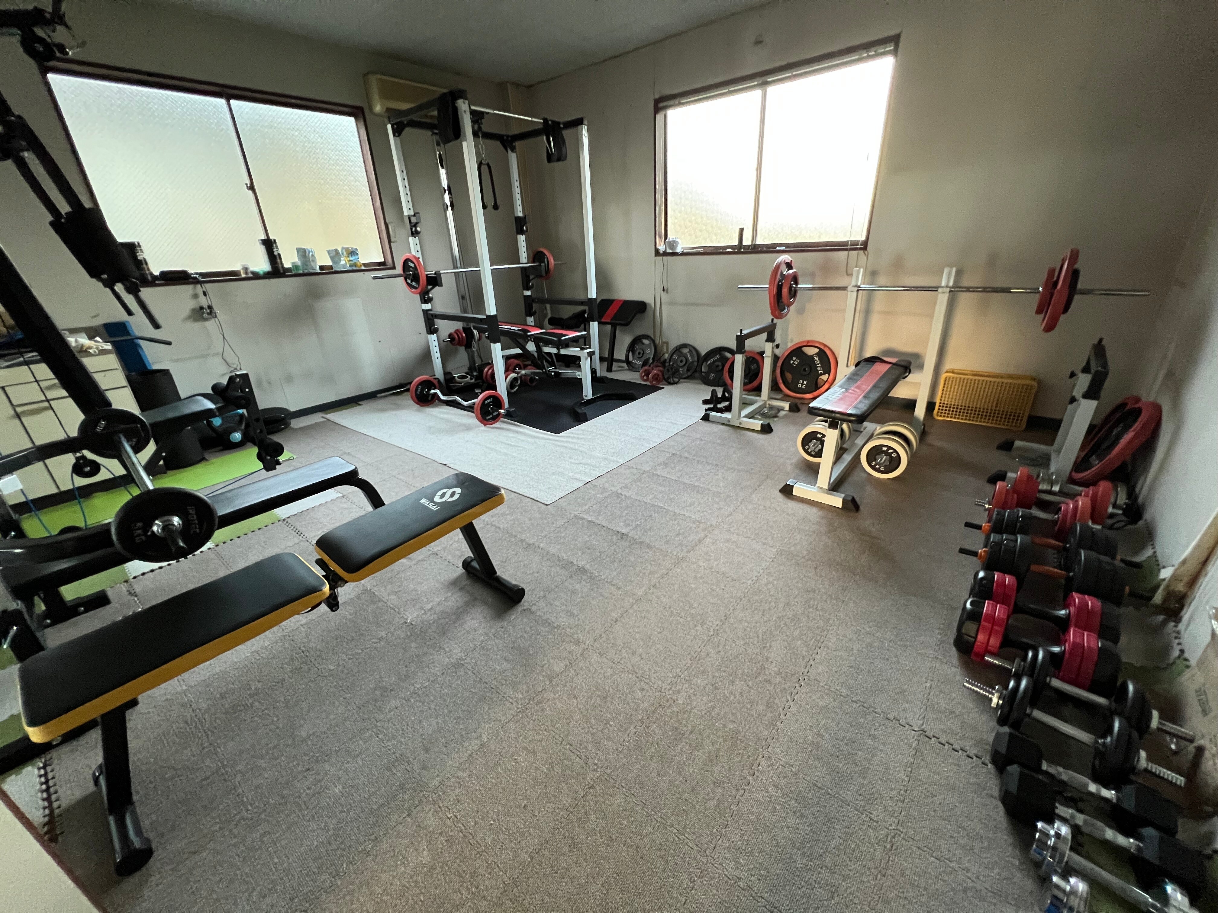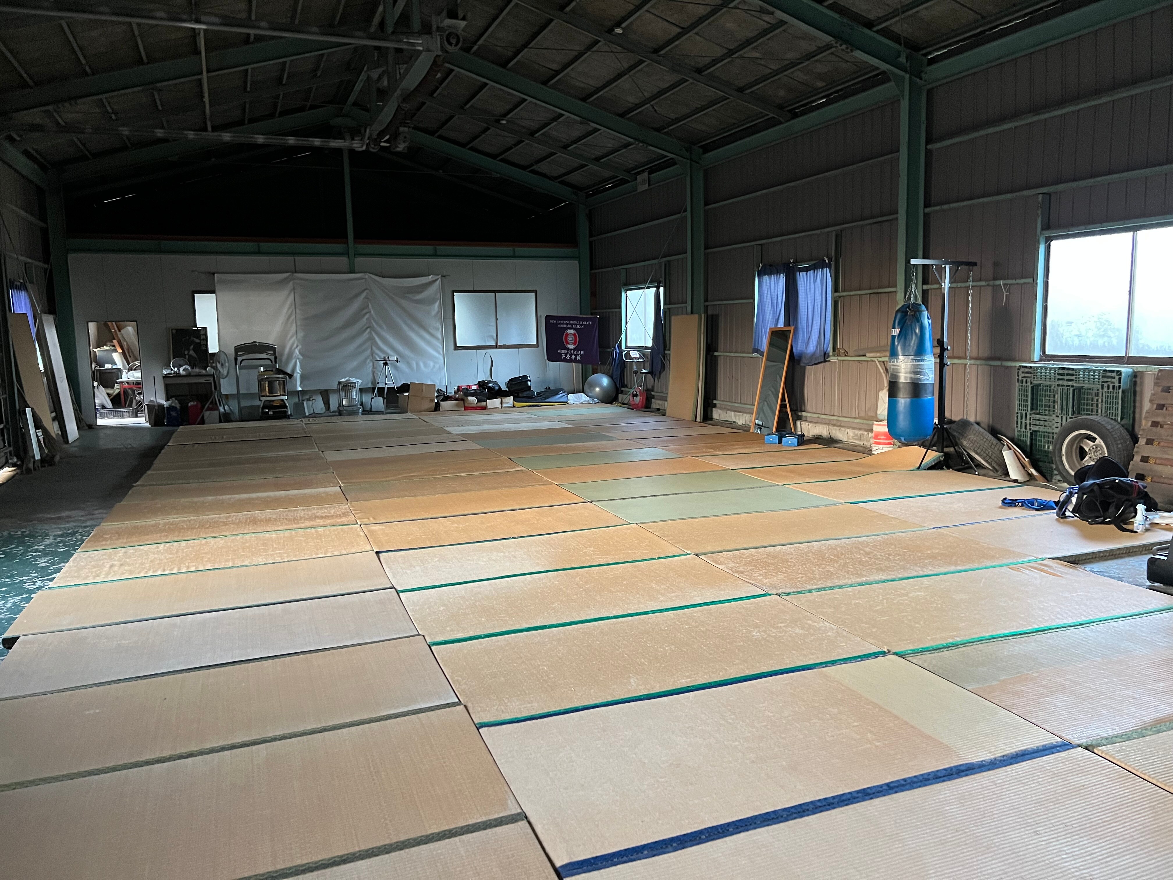 以前は工場だったこの場所には、キックミットやサンドバッグもある80畳以上の空手道場に、フリーウェイトとマシンが常設のトレーニングルームも完備されています。