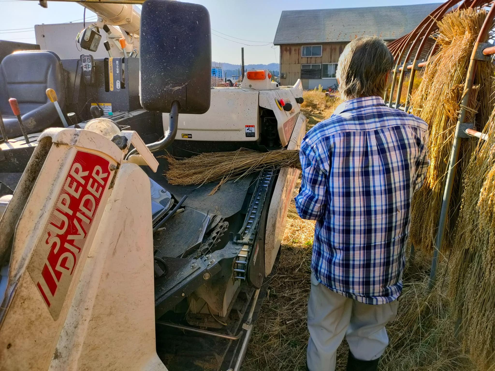コンバインに手作業で稲を投入し、脱穀していきます。