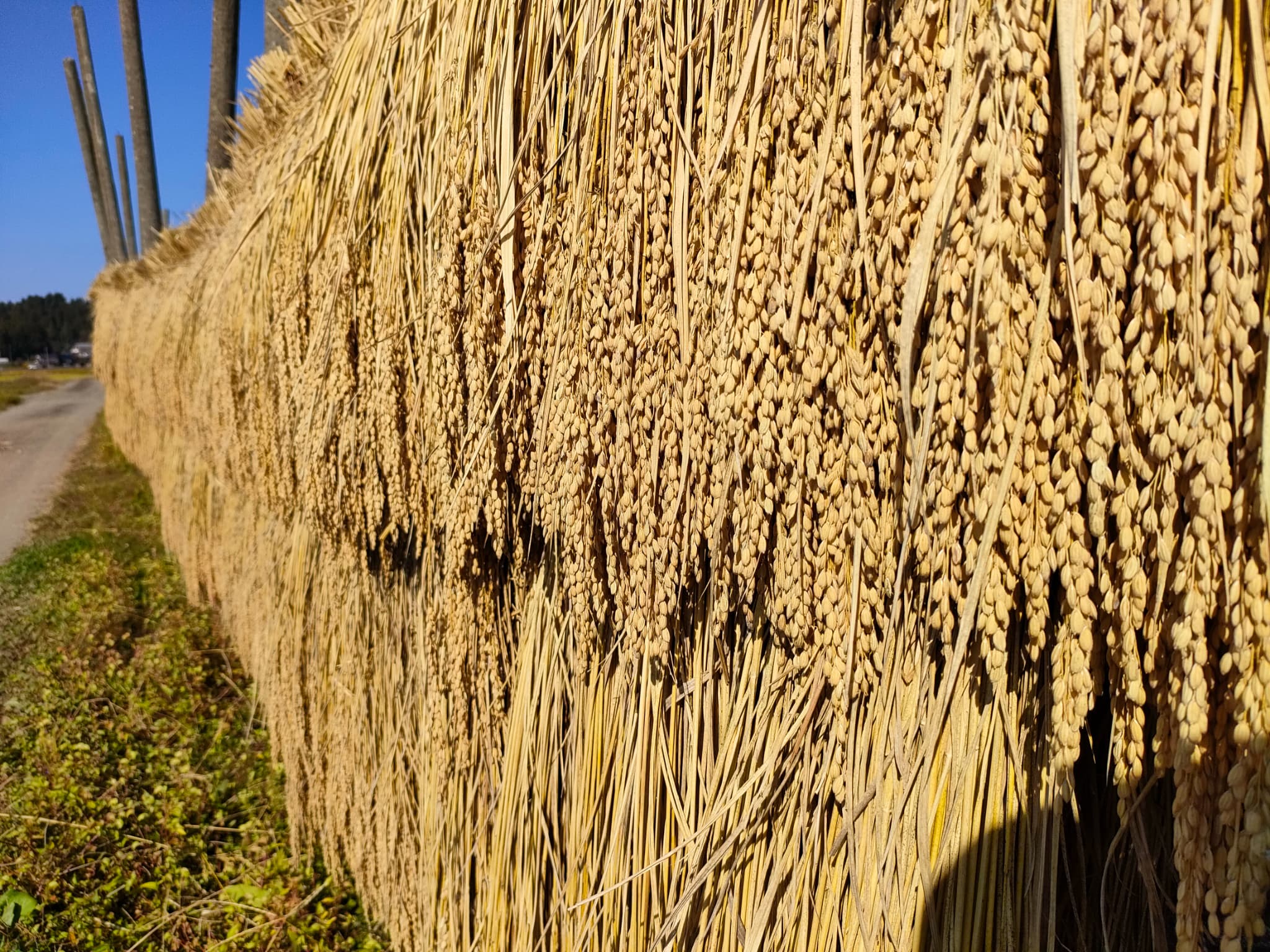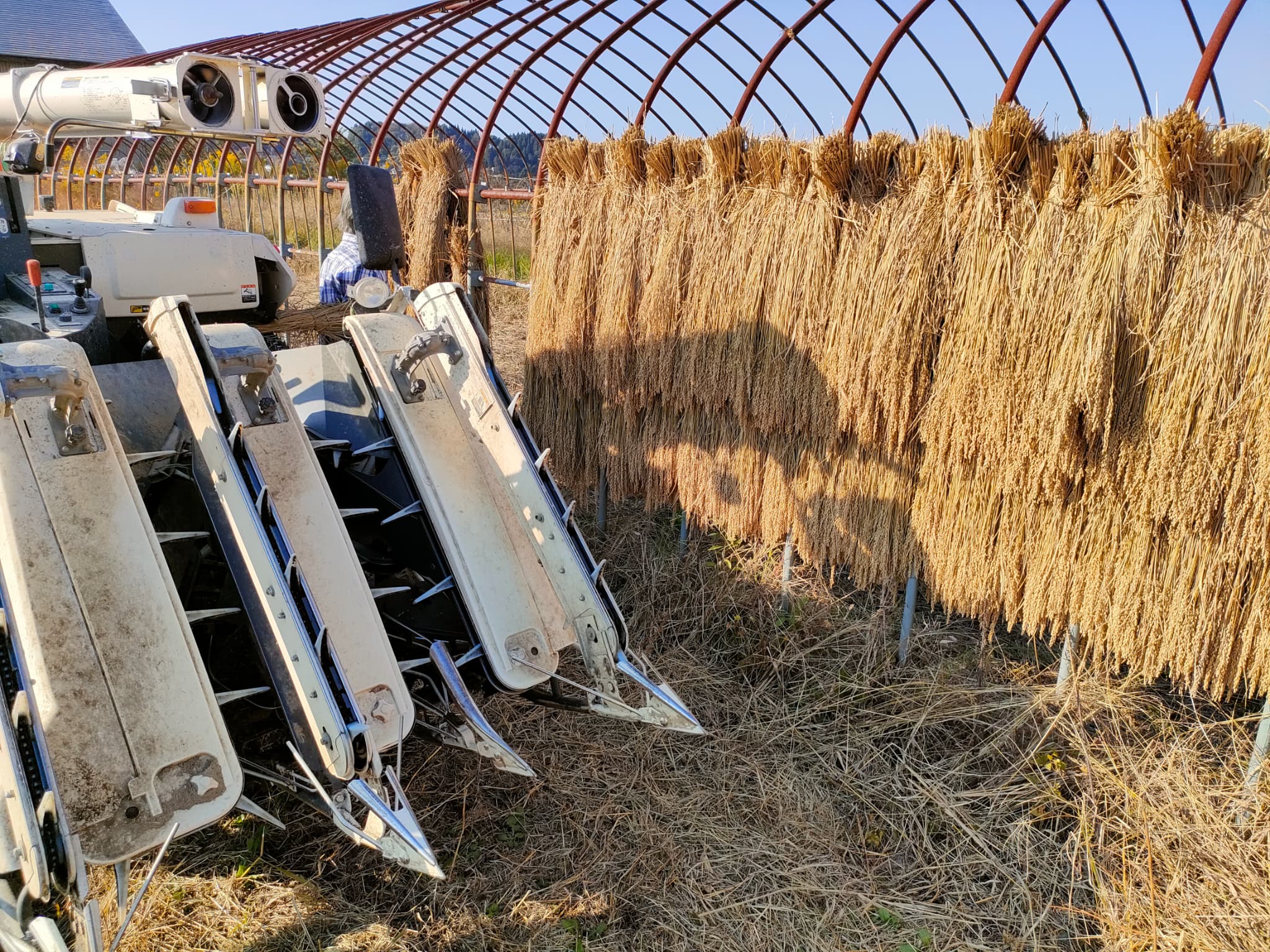 ハサ掛け天日乾燥していた種籾用の稲。