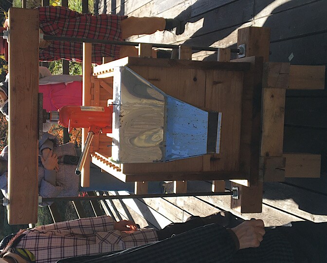 今年は、去年借りたデッキが修理中で使えず、池のほとりのテントの中で絞ります。