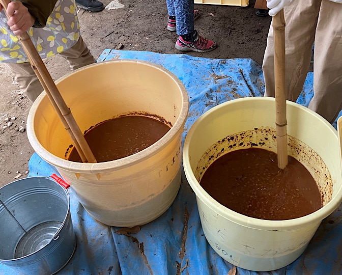 1人がひたすら混ぜ、1人が袋の口を開けて持ち、1人が計量カップ(2L)でもろみを汲んで袋に入れます。