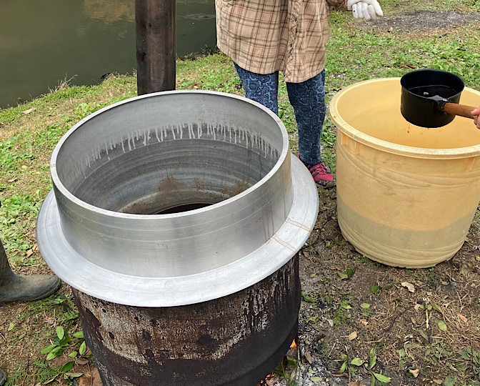 グラグラお湯を沸かすために、ガンガン火を炊くのですが、隣で冷まし中の醤油に灰が入っちゃう!!