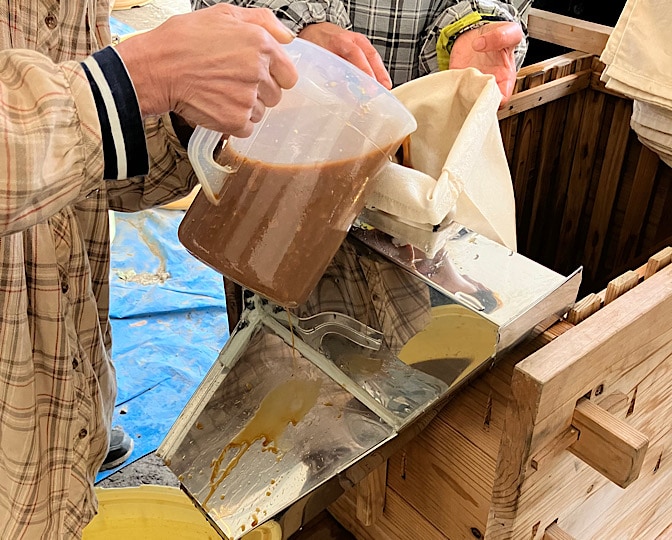 絞り師さんは、1人で袋掛けから混ぜ混ぜから、袋詰めまで全部、しかも華麗な柄杓さばきでやりますが、我々は3人がかりでやります。