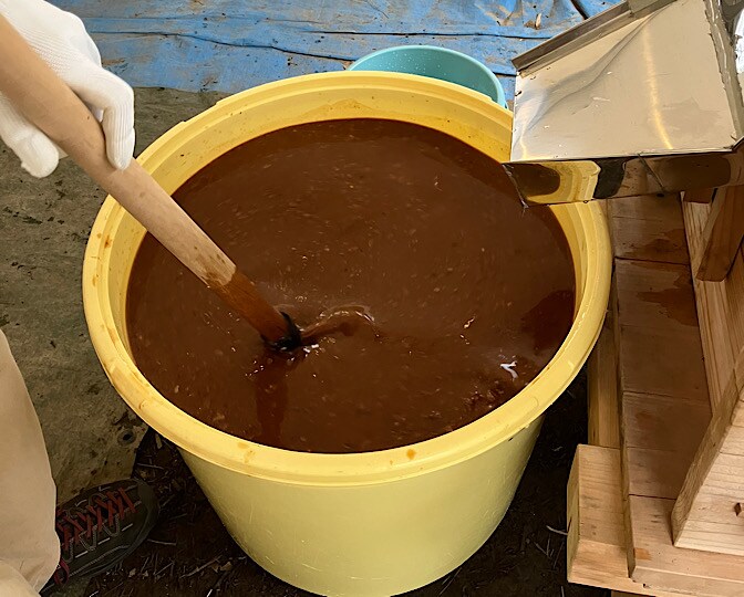 ささらでかき混ぜて、もろみからお湯に、醤油成分を抽出します。