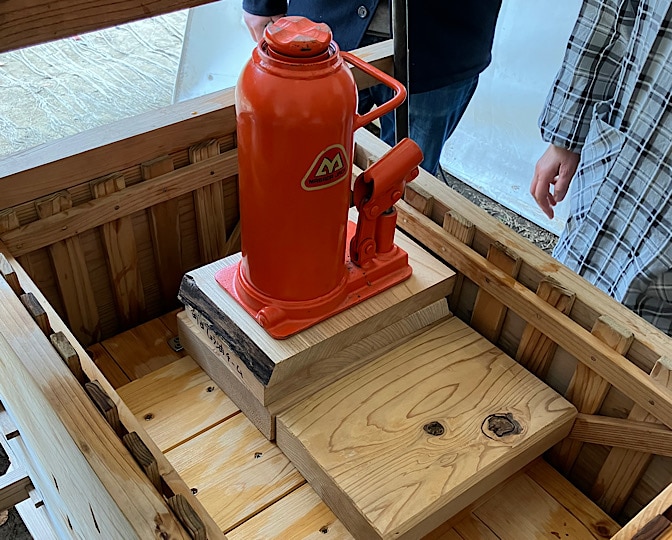 水平器でOKになったら、板を噛ませて、いよいよ圧をかけて行きますよ!