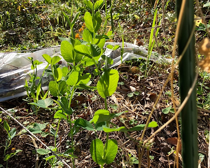 スナップエンドウ、掴まるトコ求めて迷走中みたいなので、支柱を増やしました。
