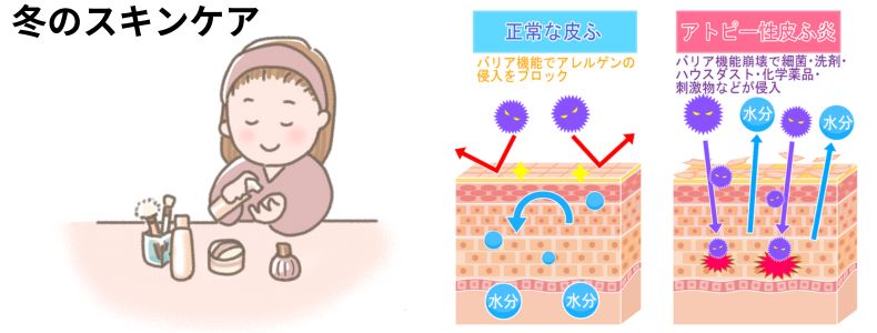 特にアトピー性皮膚炎で悩まれている方にとってはお肌が乾燥することで、バリア機能が低下し、悪化要因を作ってしまうだけでなく、安定したお肌の状態の方でしたら再発するきっかけにもなってしまうケースもあります。
