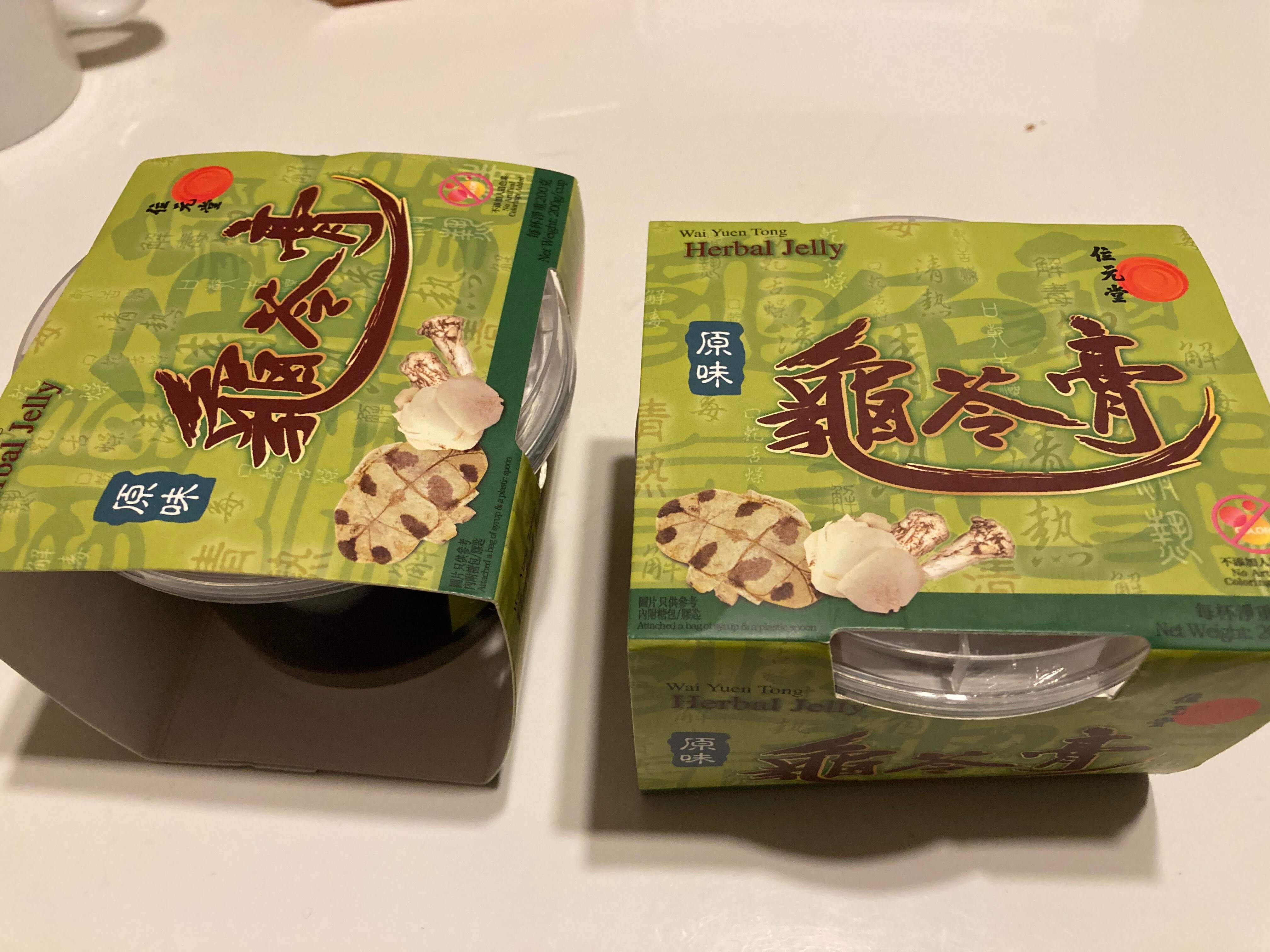 亀の甲羅漢方で作った真っ黒なゼリーです、味は、コーヒーみたいな苦味があります😊