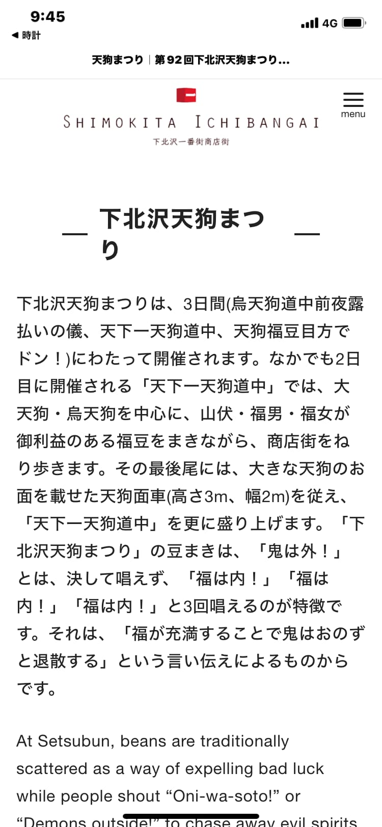 2024年2月2日(金)〜4日(日)毎年恒例の下北沢天狗祭りが開催します。