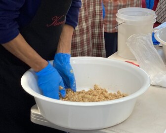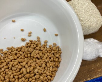 大豆のペースとから麹がパラパラしている状態はまだまざりきれていないよと教えてくれました。
