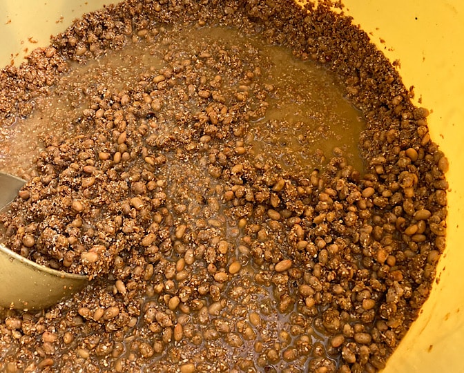 豆を潰さないように、スクレーパーで集めてまとめたのを、柄杓で取るようにしました。