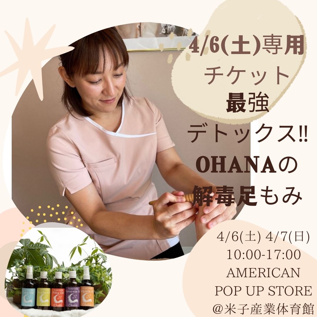 🌺AMERICANPOP UP STORE4/6(土)、4/7(日)10:00-17:00Ohanaの解毒足もみすご〜く痛い足もみ🦶15分2500円米子産業体育館