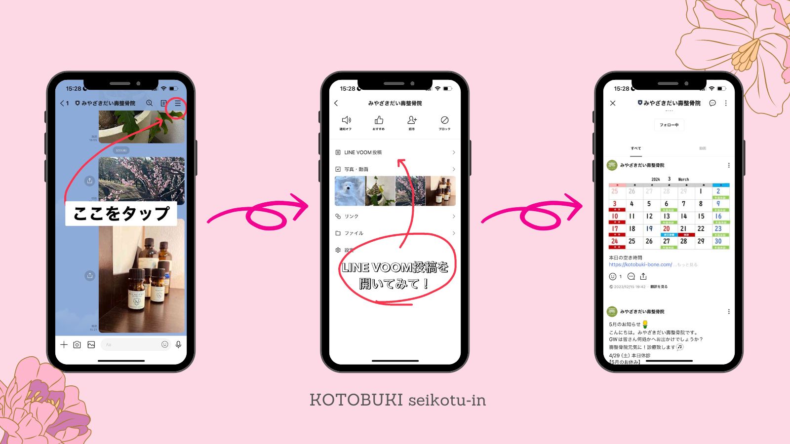 ①トーク画面を開いて右上の三本ラインから→②LINE VOOM投稿に進むと→③カレンダーが見れます。