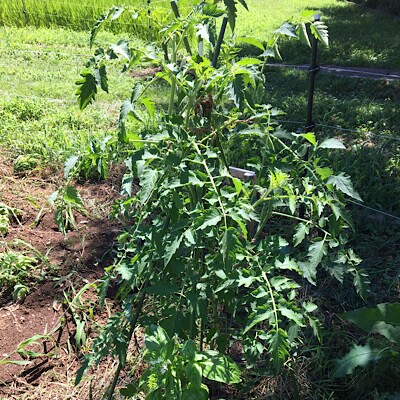 トマトって、上の方をまとめて全体的に真っ直ぐにすると、育ちが良くなる…と習ったので、そんな感じに誘引してみました。