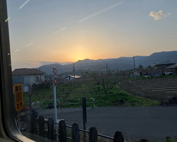 途中、車窓からのダイヤモンド〇〇山に感動ーー!! と思ったら、山際から夕陽がひょっこり出たり引っ込んだり…!!