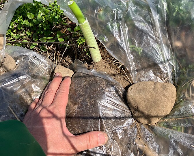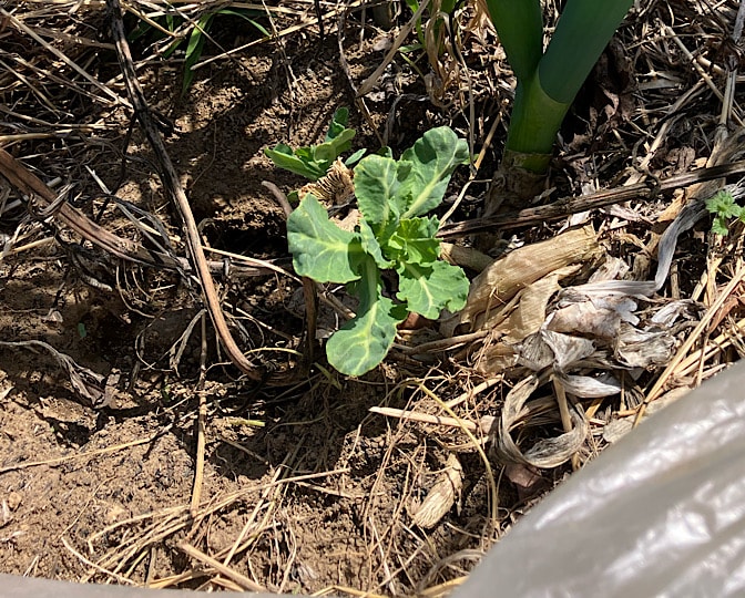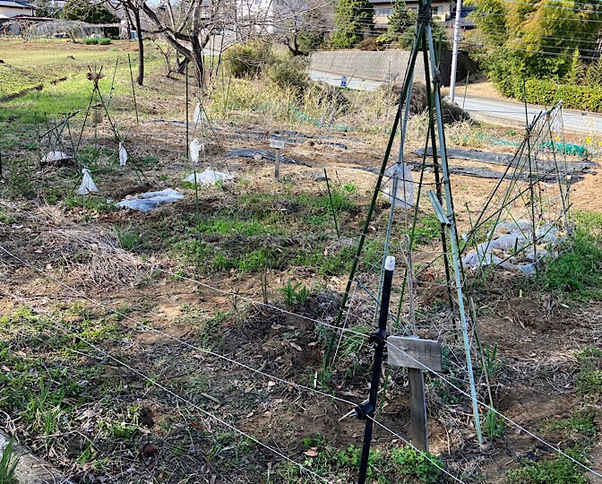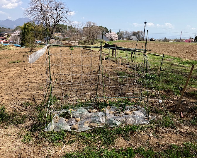 《なんちゃって菌ちゃん農法》の畝には、カボチャ用ネギ鞍つき。