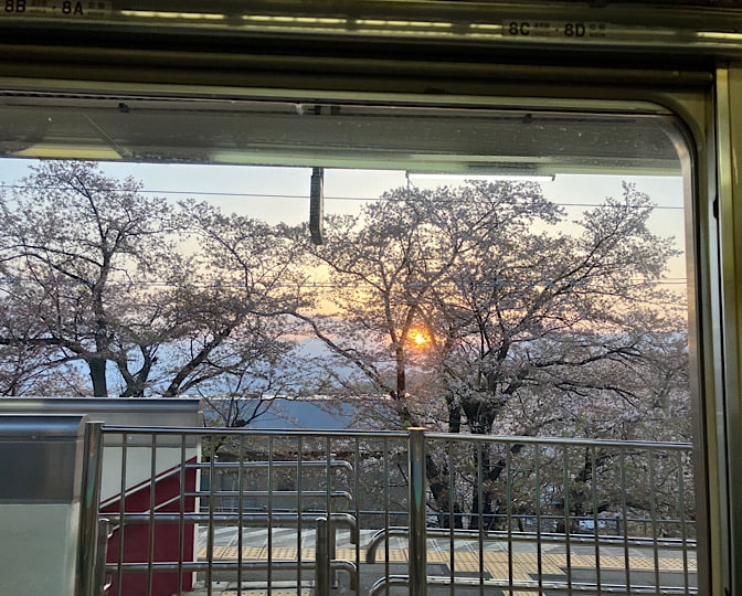 で、勝沼ぶどう郷駅にきたら、逆側の車窓から、桜の向こうにまん丸な夕陽が!!