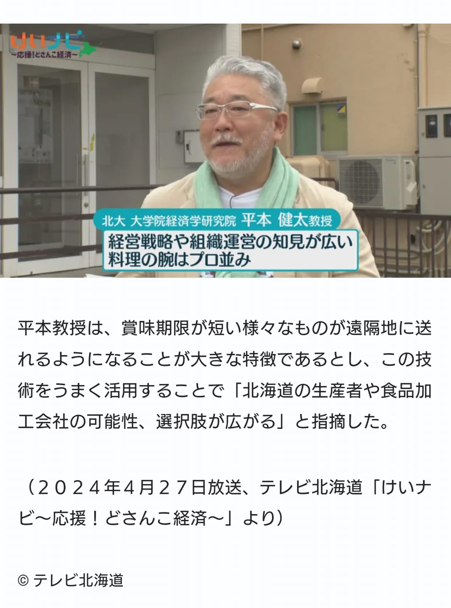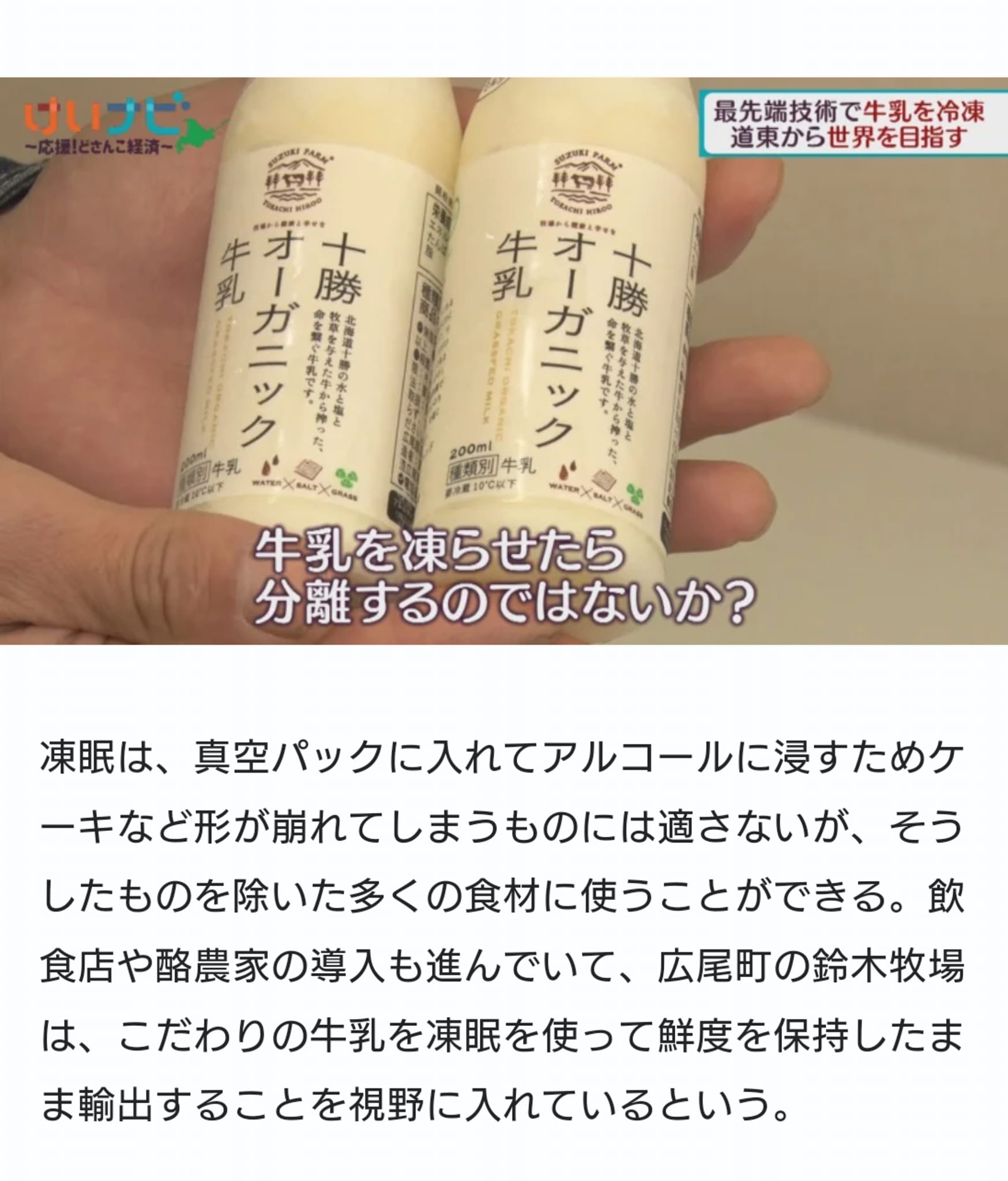4月27日に放送されたTVh『けいナビ』で紹介された凍眠×オーガニック牛乳の番組動画(全国版)をご覧になれるURLリンクがあります。