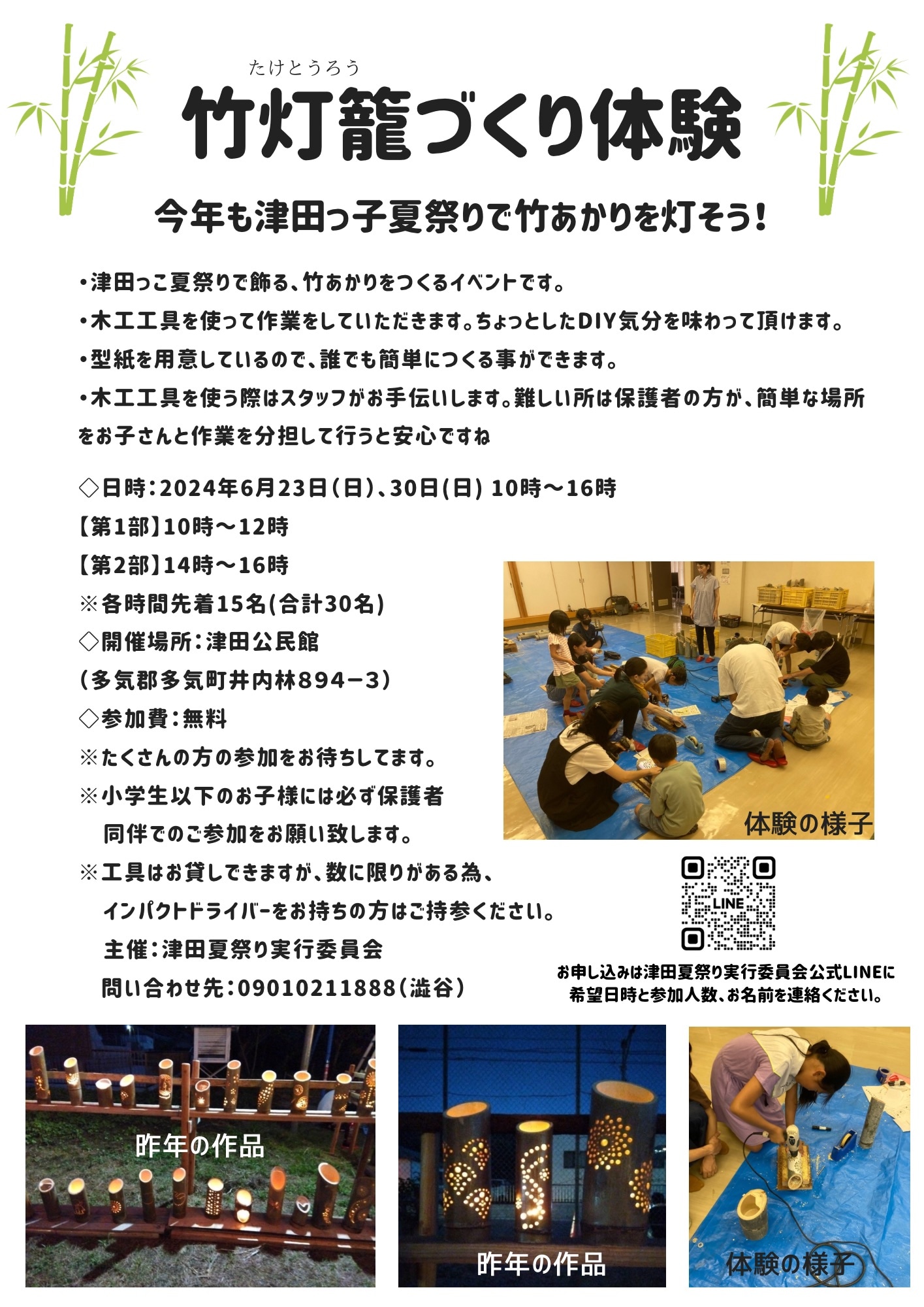竹燈籠作りは6月23日(日)10時~16時、6月30日(日)10時~16時の予定で行います。各日、約30名ほど、作業をしてくださる方を募集しております。ご参加をお待ちしております。