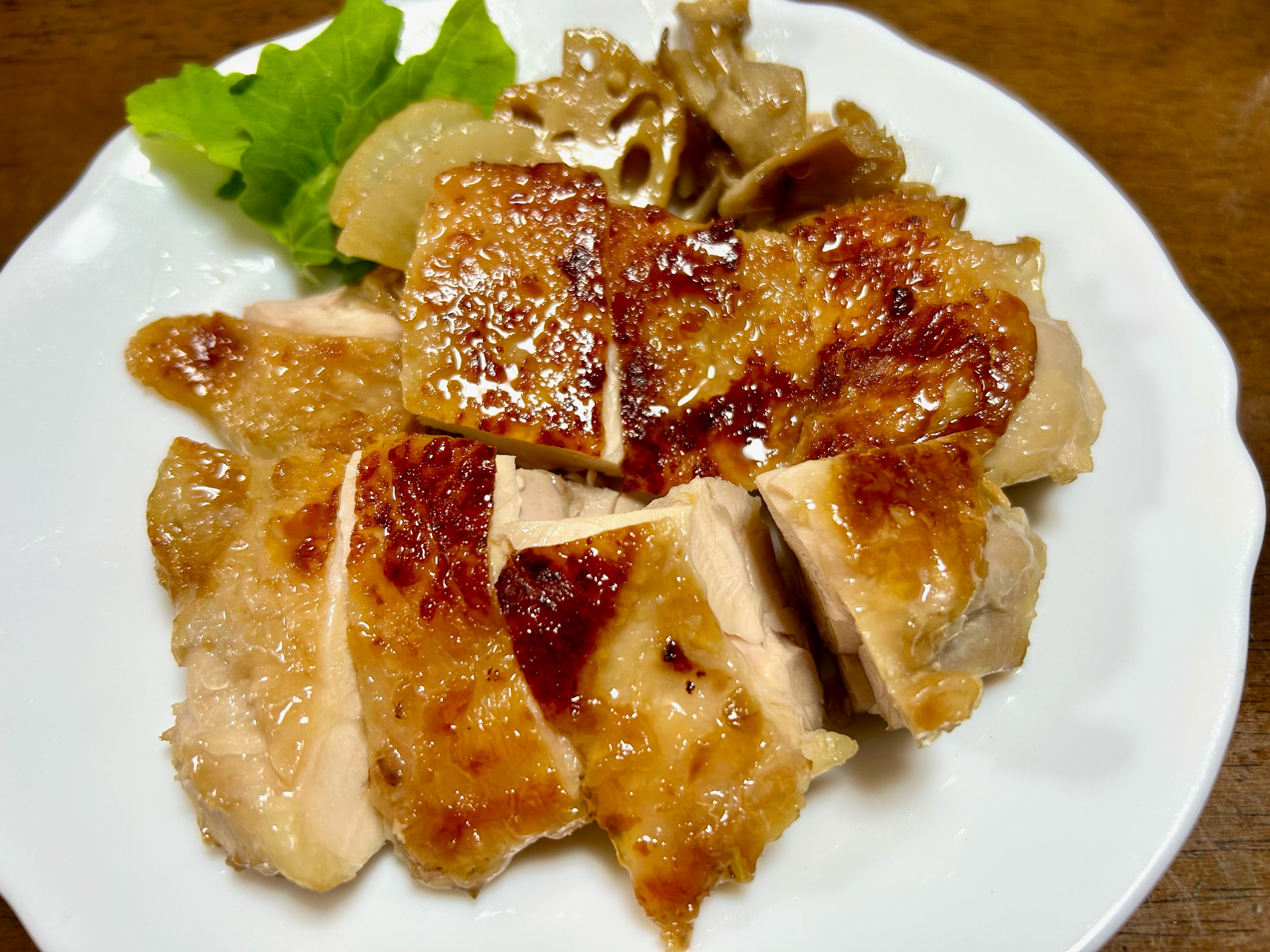 島村兄弟黒酢玉ねぎドレッシング 鶏肉(皮つきもも肉) 塩こしょう 大根 れんこん まいたけ 彩りに緑の菜 ■作り方 1.鶏肉に塩こしょうをする 2.フライパンに油を引き、 弱火で鶏肉の皮がパリカリになるまで焼く 3.その他の具材を入れる 4.鶏肉に焦げ目がついたらひっくり返す 5.全体に火が通るまで待つ 6.火が通ったら皮が裏面になるようにひっくり返す 7.ドレッシングをかけ、染みるまで煮込む 8.皿に乗せ、彩りを添える ドレッシングにオイルが入っているので、皮がパリパリに焼けます! |