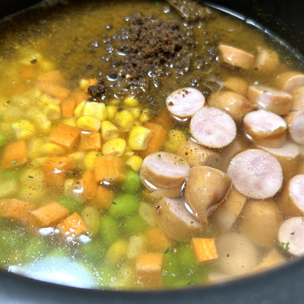 島村兄弟玉ねぎスープ 小さじ4杯 カレー粉 大さじ2杯 洗い米 2合 ウィンナー 4本 人参、コーン、枝豆など 80g 水 400cc バター 少量 ■作り方 1.洗い米に具材をいれる ※ミックスベジタブルでOK 2.玉ねぎスープとカレー粉を入れる 3.水を入れる 4.よく混ぜる 5.炊飯スイッチを入れる 6.炊き上がりに、お好みで少量のバターを入れる 7.お好みでパセリなどをふりかける |