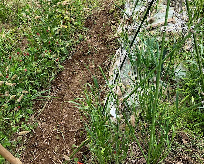 今日の予定は、畝周りだけ、緑肥を刈って耕します。