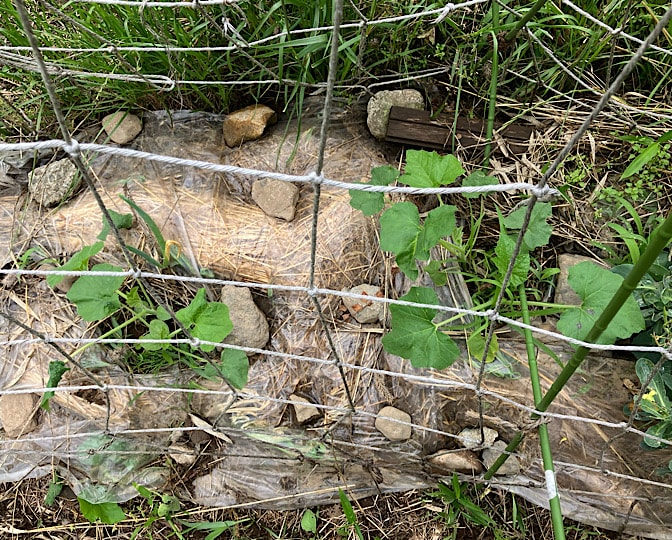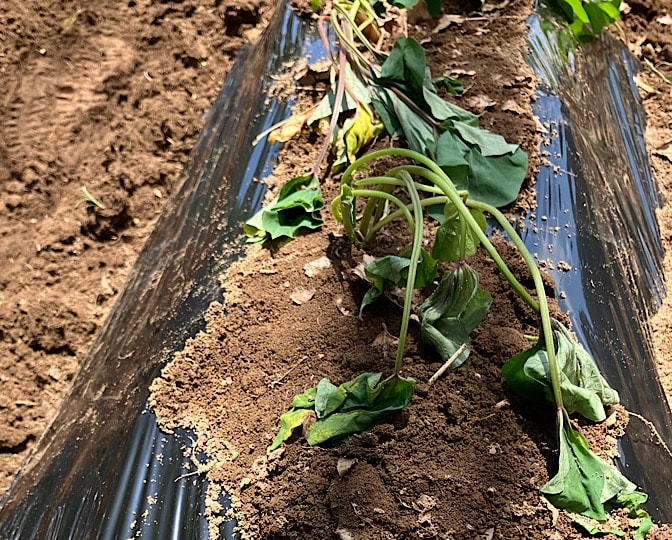 去年、黒マルチのままだと熱くなり過ぎて、苗が枯れちゃった事件が発生したそうなので、茎や葉っぱがかかる部分に土を乗せます。