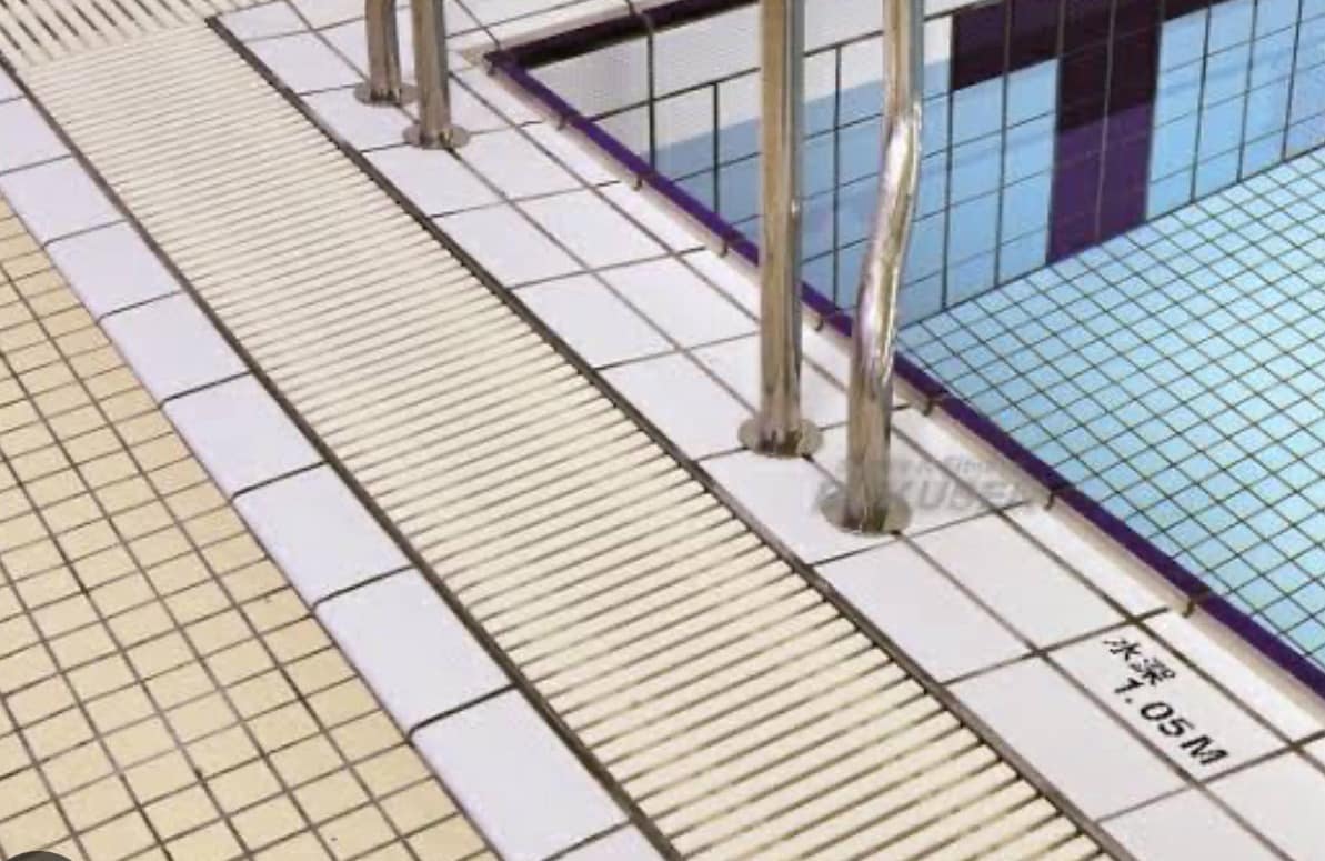 つま先をプール排水溝の蓋と蓋の隙間に挟み込み