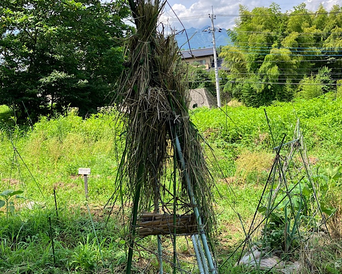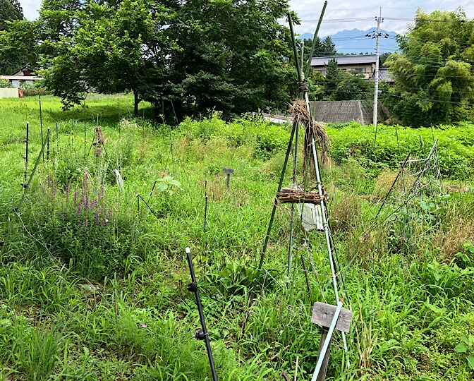 オーツ麦とかホソムギなんかは、ハザ掛け風にして、《蜂っちんのお宿》の雨避けの足しに…。