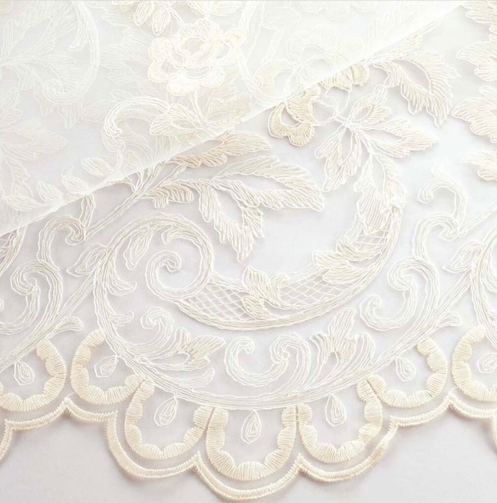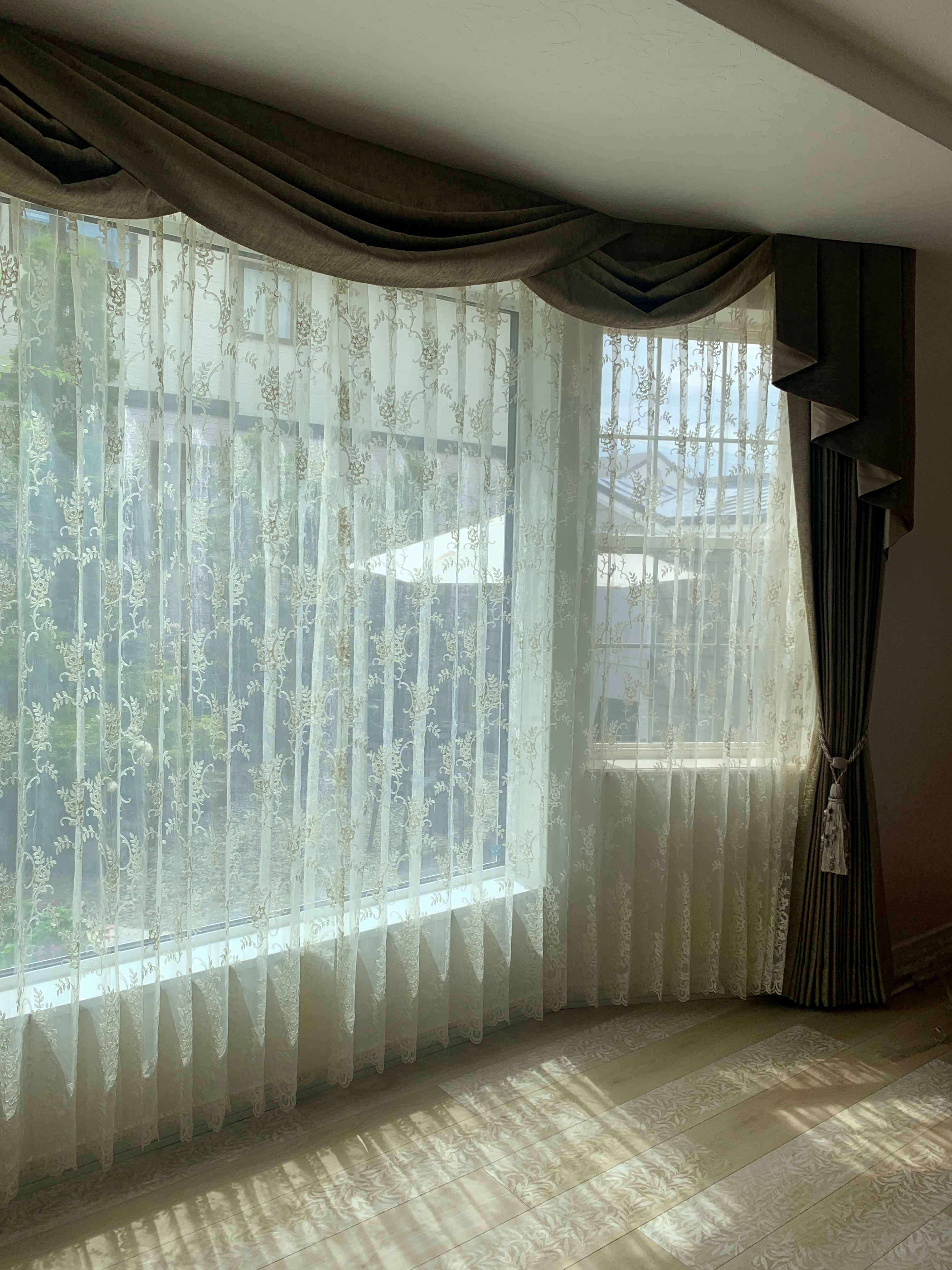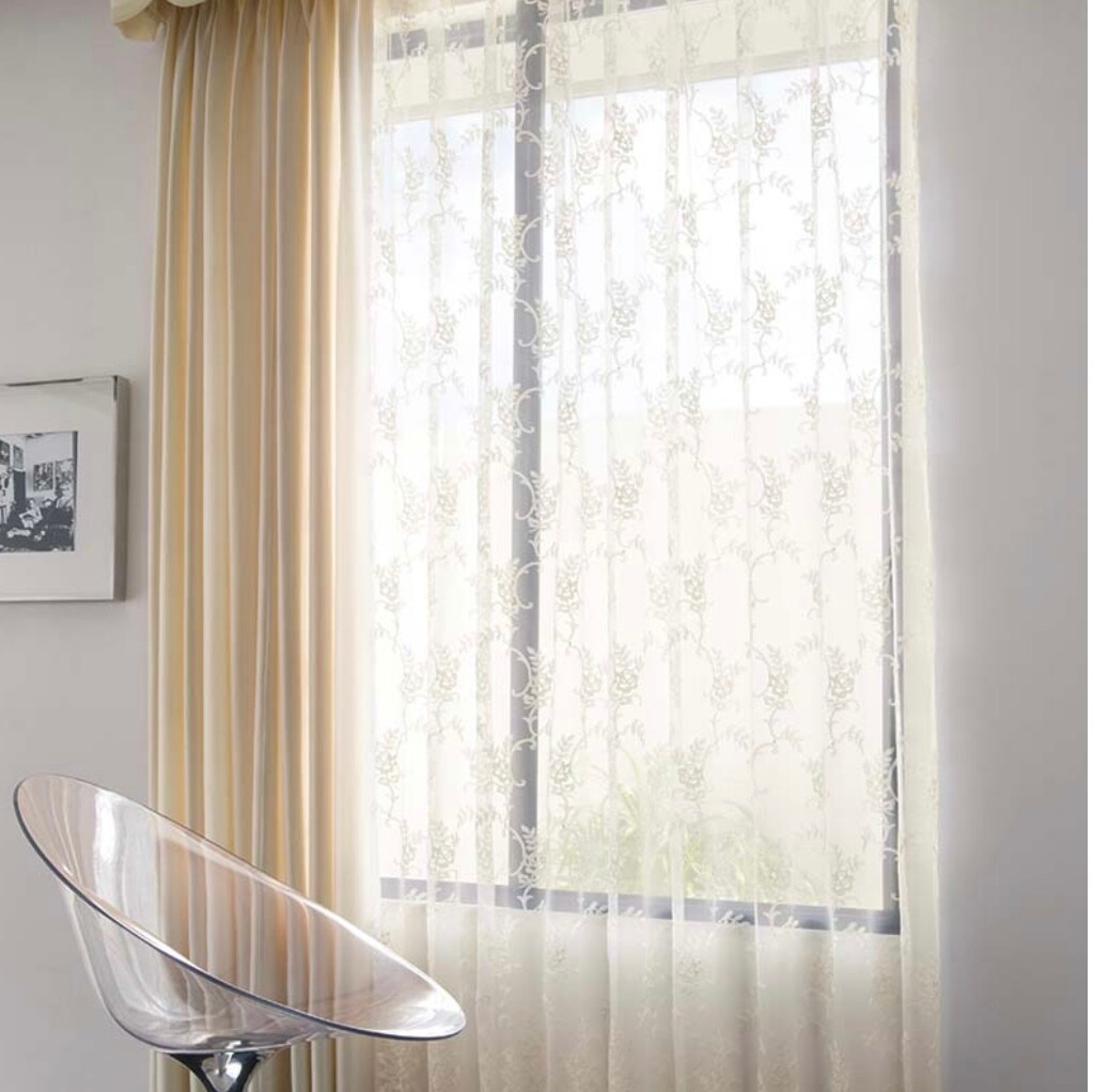 細い糸の周りに太い糸を巻いた特別な刺繍糸を使用した、クラシックエレガントな雰囲気のシアーカーテン。