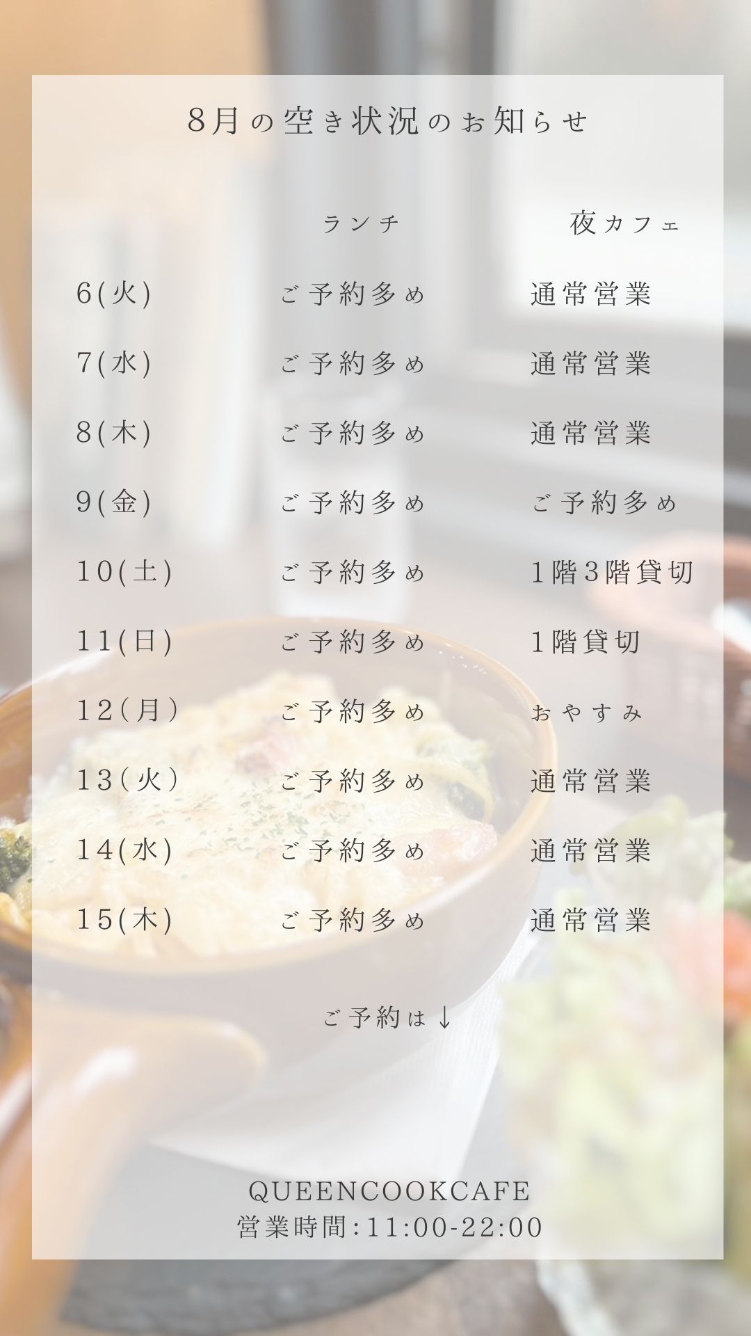 本日から8月31日までご予約がかなり多くなってます