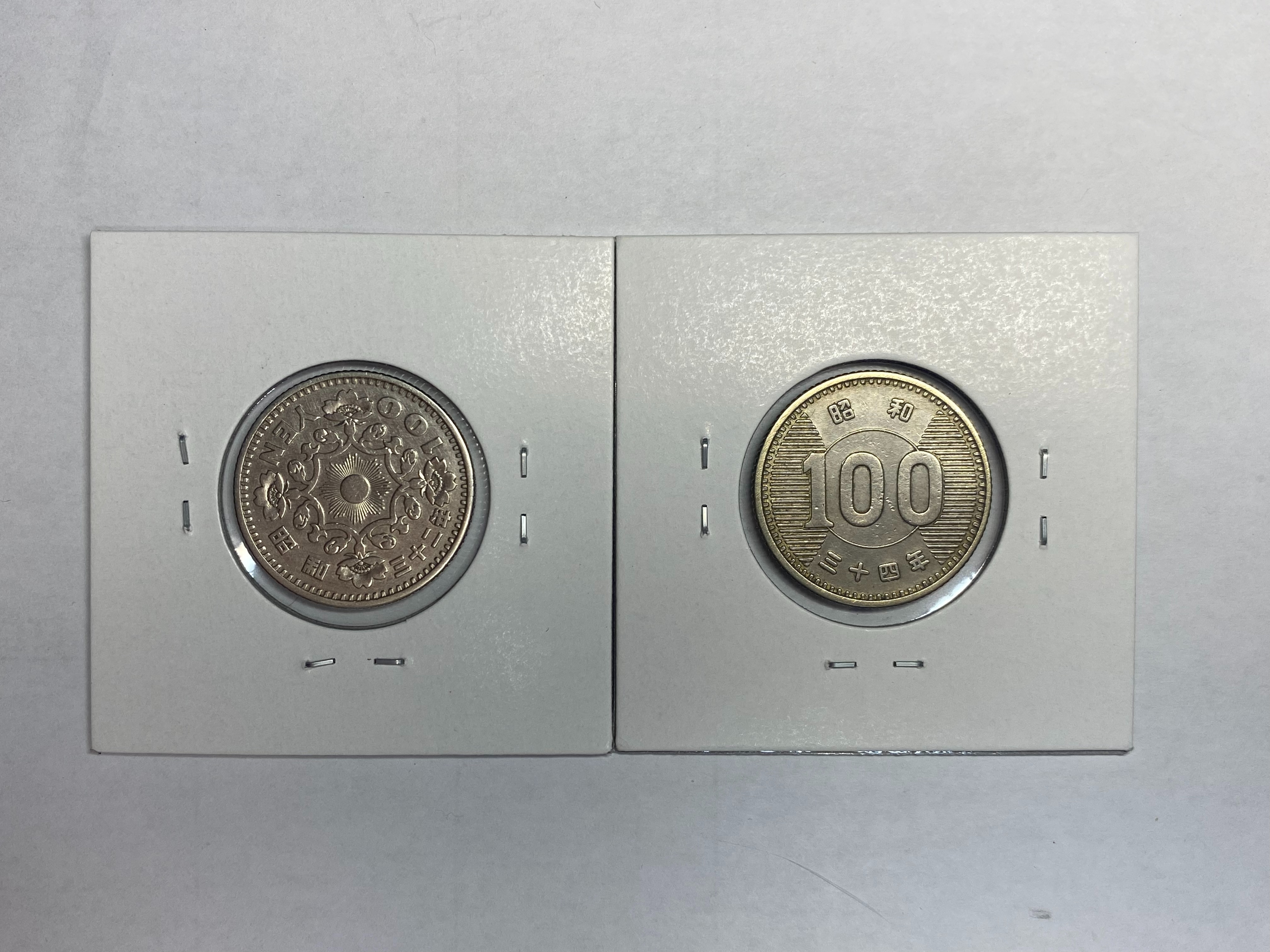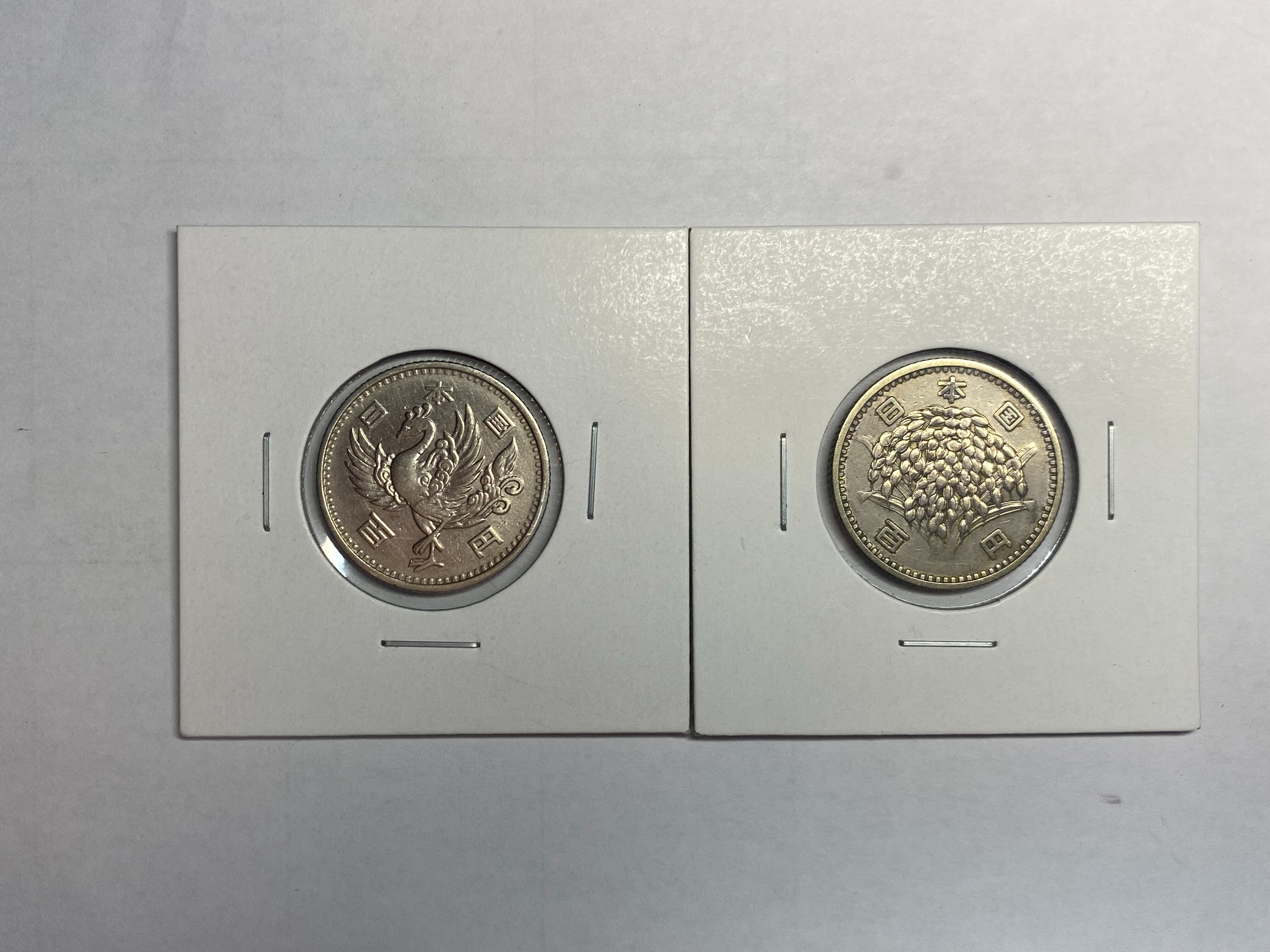 左:鳳凰100円銀貨(表:鳳凰 裏:旭日を囲む桜花) 右:稲100円銀貨(表:稲穂 裏:分銅)