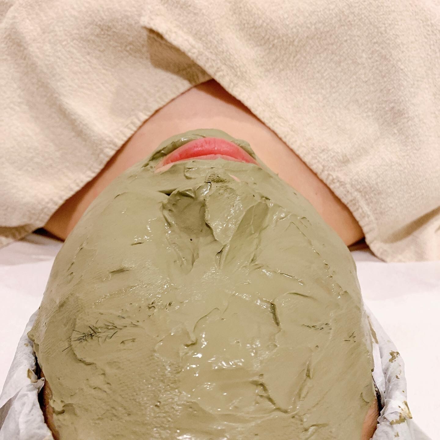 という風に筋膜の癒着を弛めて流します。その後はフェイスクレイパックで老廃物を吸収吸着します。