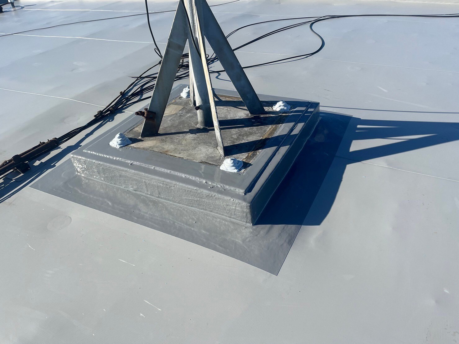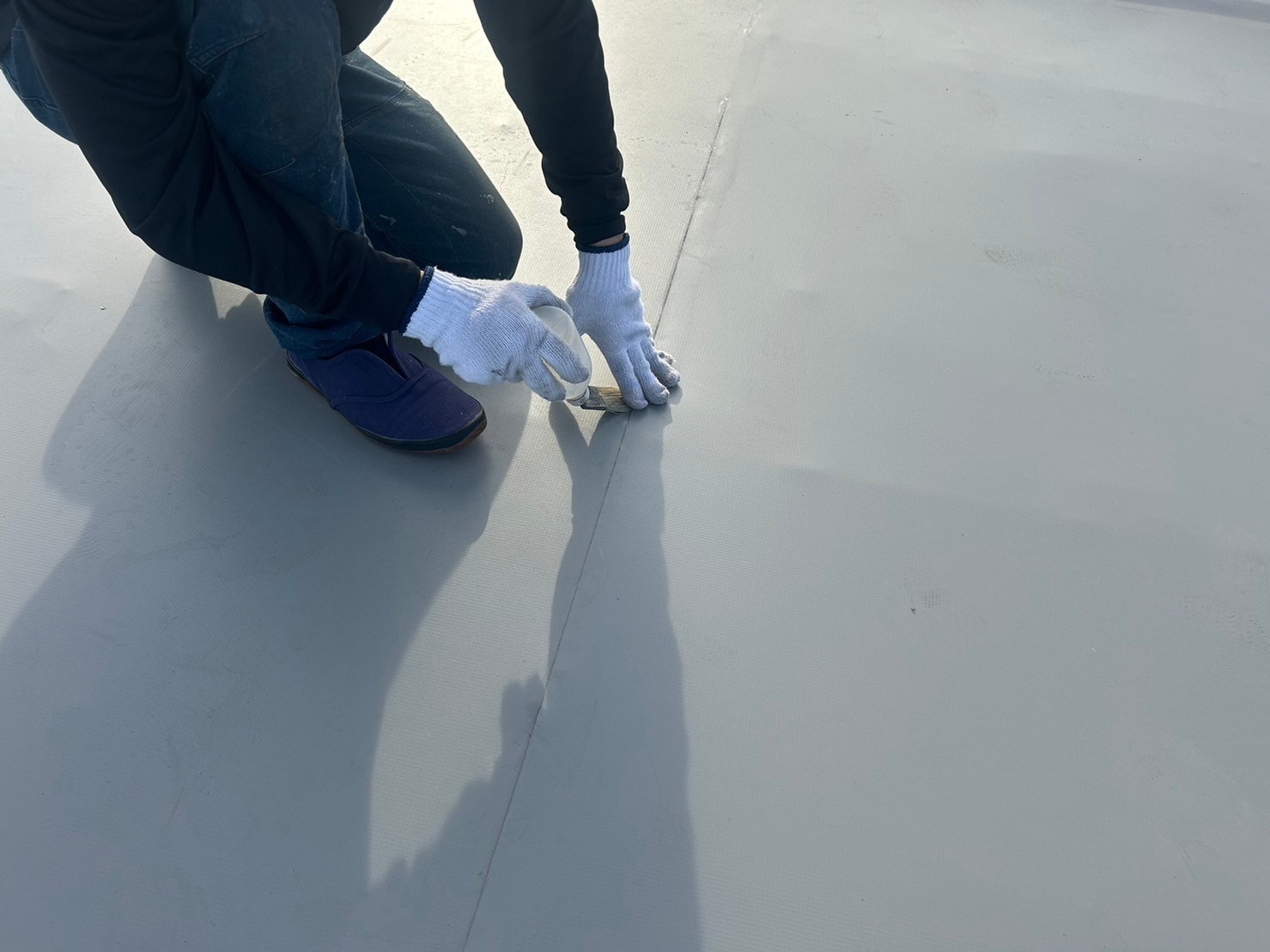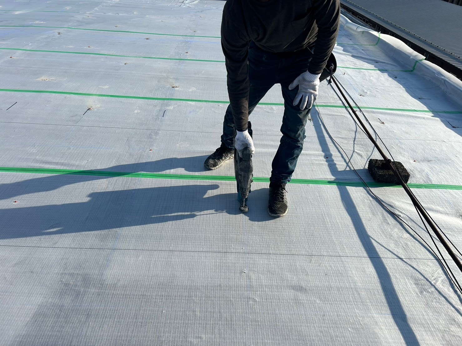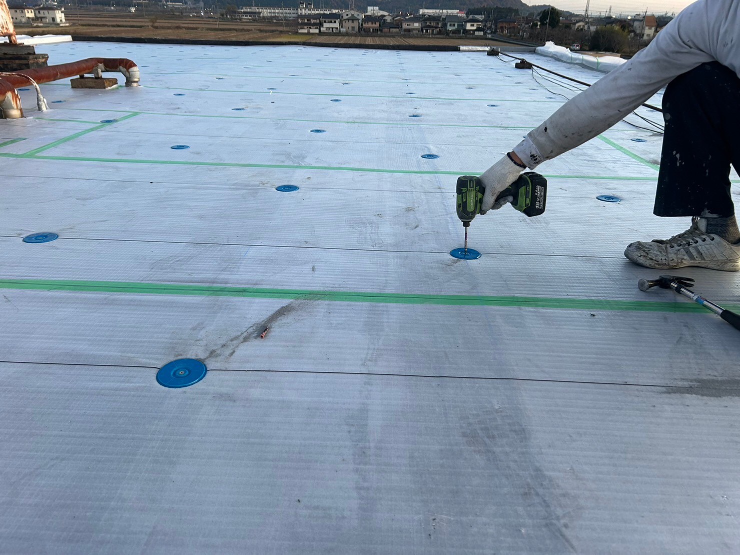 以前でしたら既存のゴムシートを全て撤去し、下地補修して張替えという選択肢しかなかったですので、費用はかなり高額になり手を付ける事が出来なくて、応急処置的に部分補修で雨漏りを止めて凌ぐという事例が多かったですが、近年はこのような下地の悪い状態であっても、下地を選ばないという塩ビシート防水、機械的固定工法という万能な工法が需要があり施工されるようになりました。