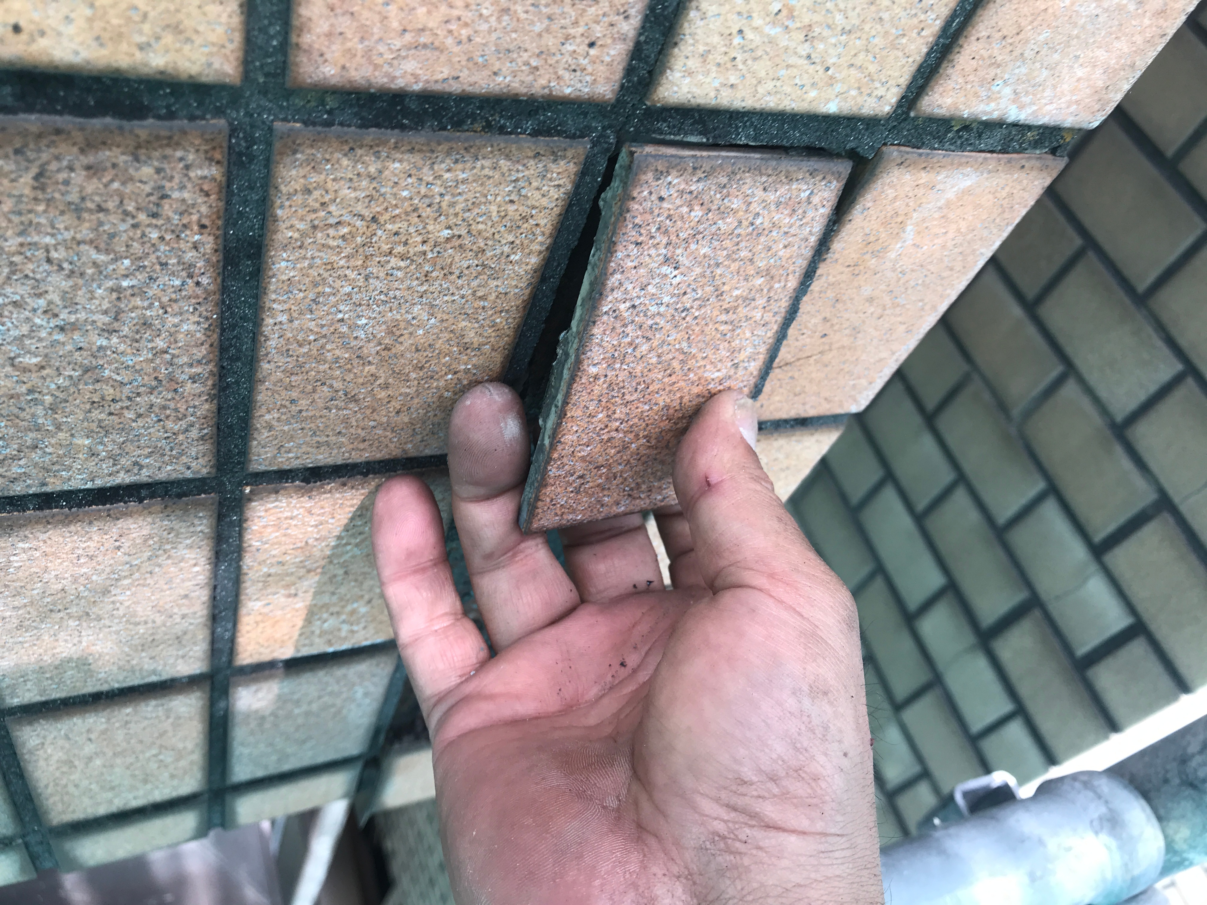 見た目にはわかりませんが、打診をするとタイルが浮いている部分は音が変わり、後々に剥がれそうな部分は全て除去しなければなりません。