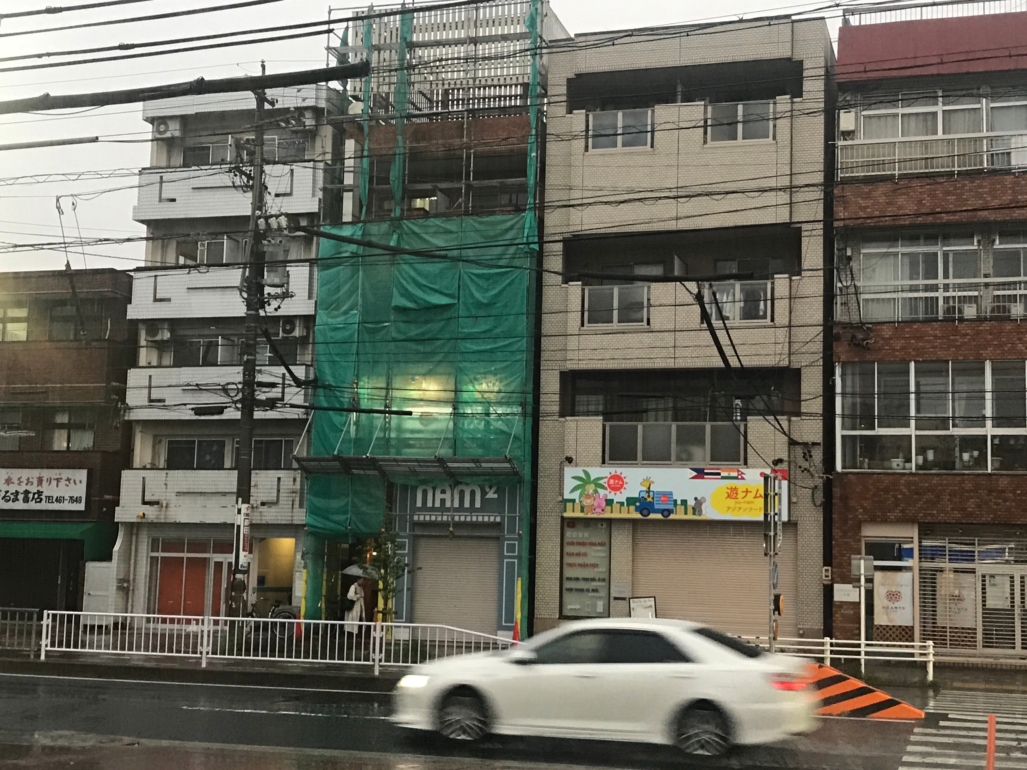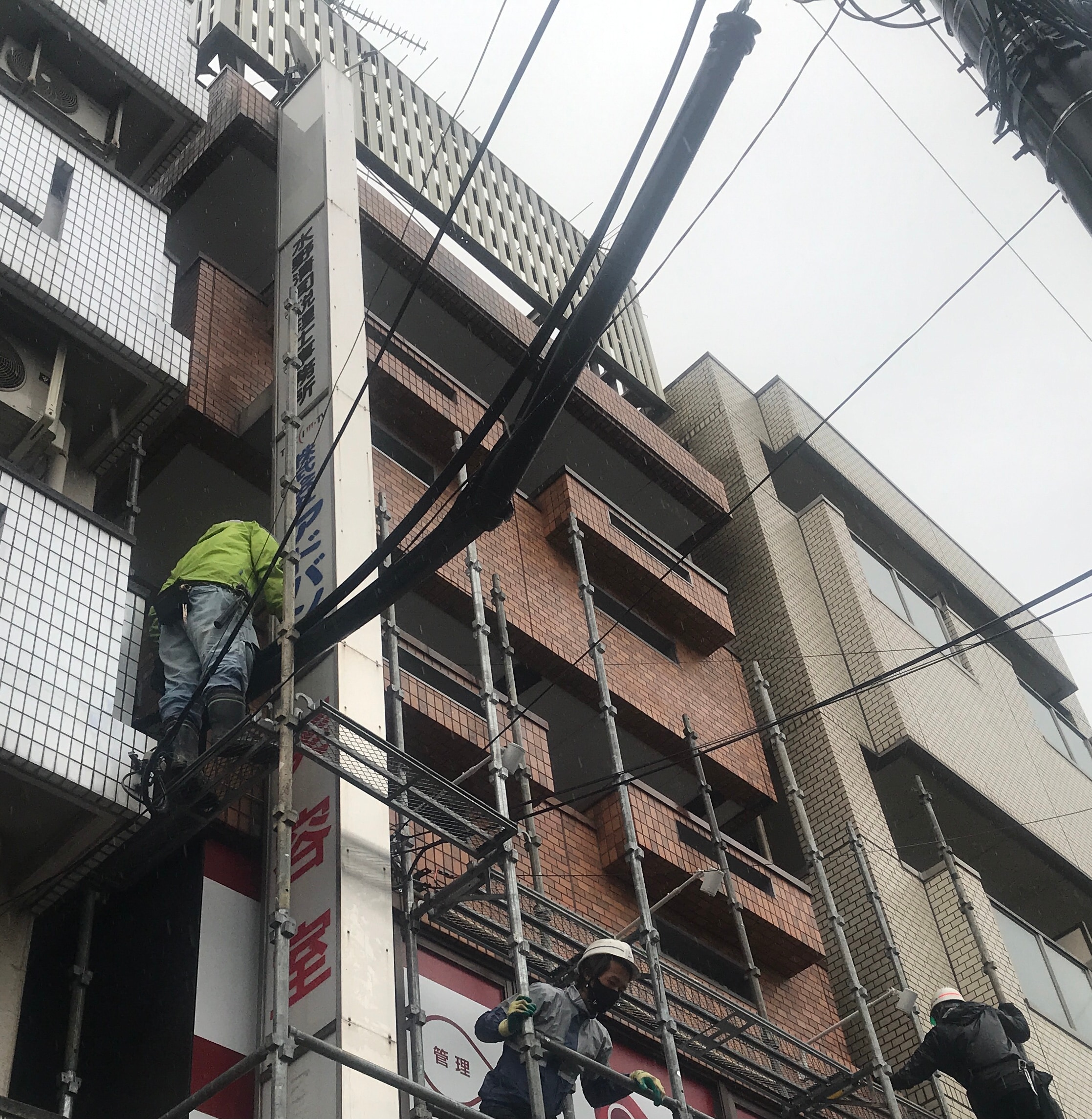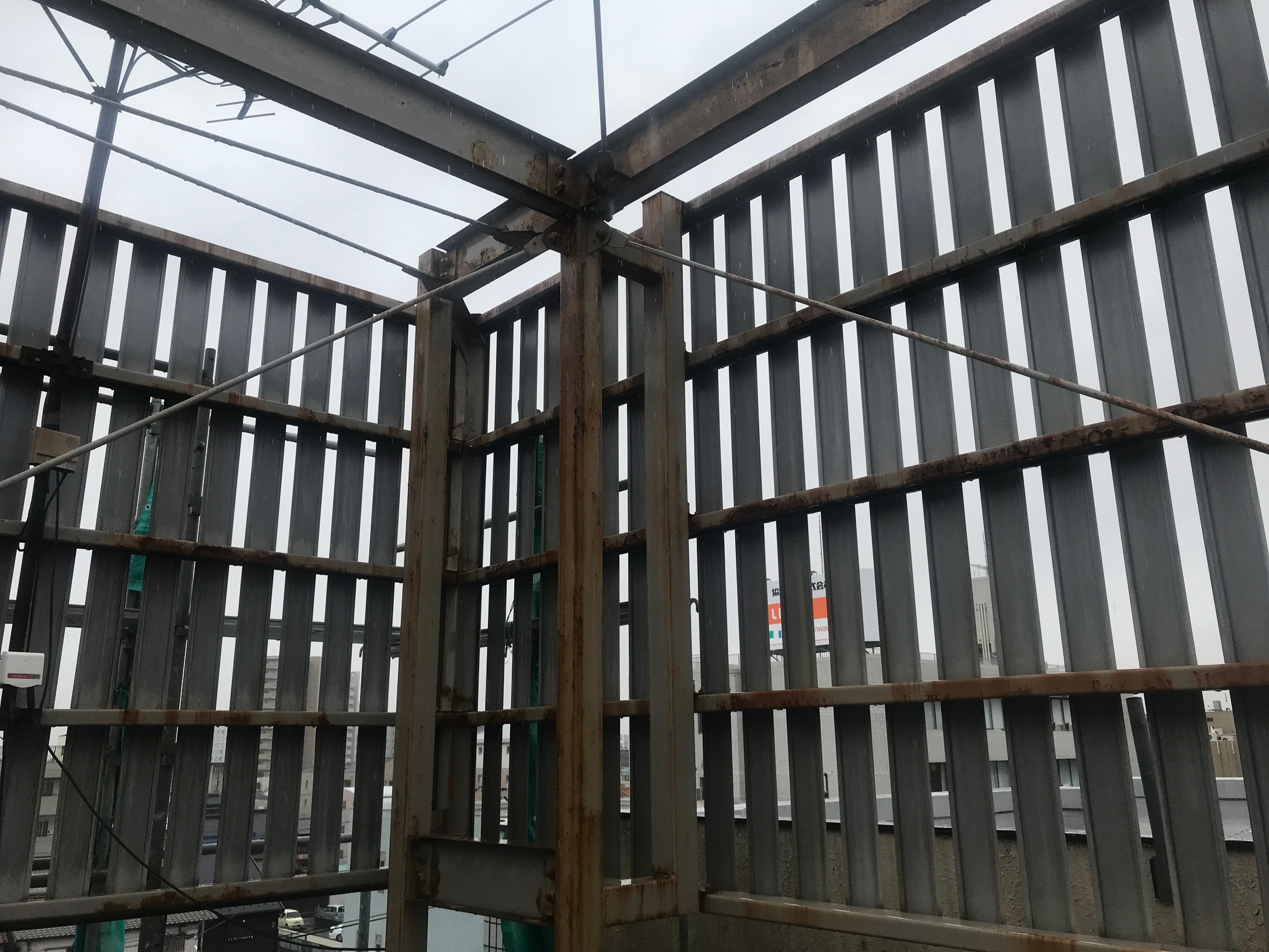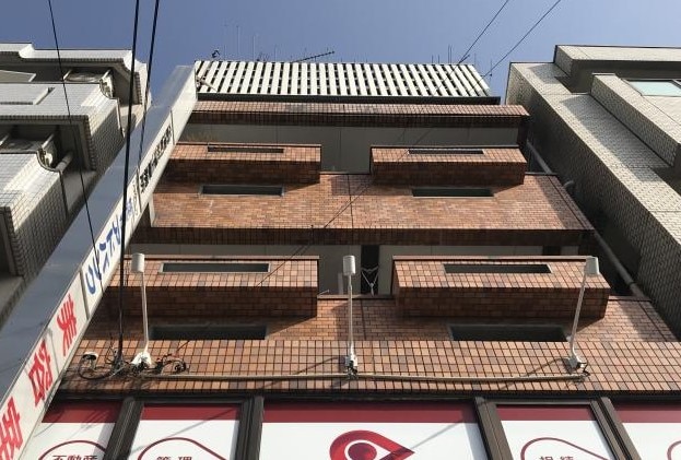 4階建ての鉄骨構造で正面はタイル張りでしたが、所々で漏水によりスチールが腐食していた為、タイルが剥落しそうな部分や既に剥落している個所もありました。