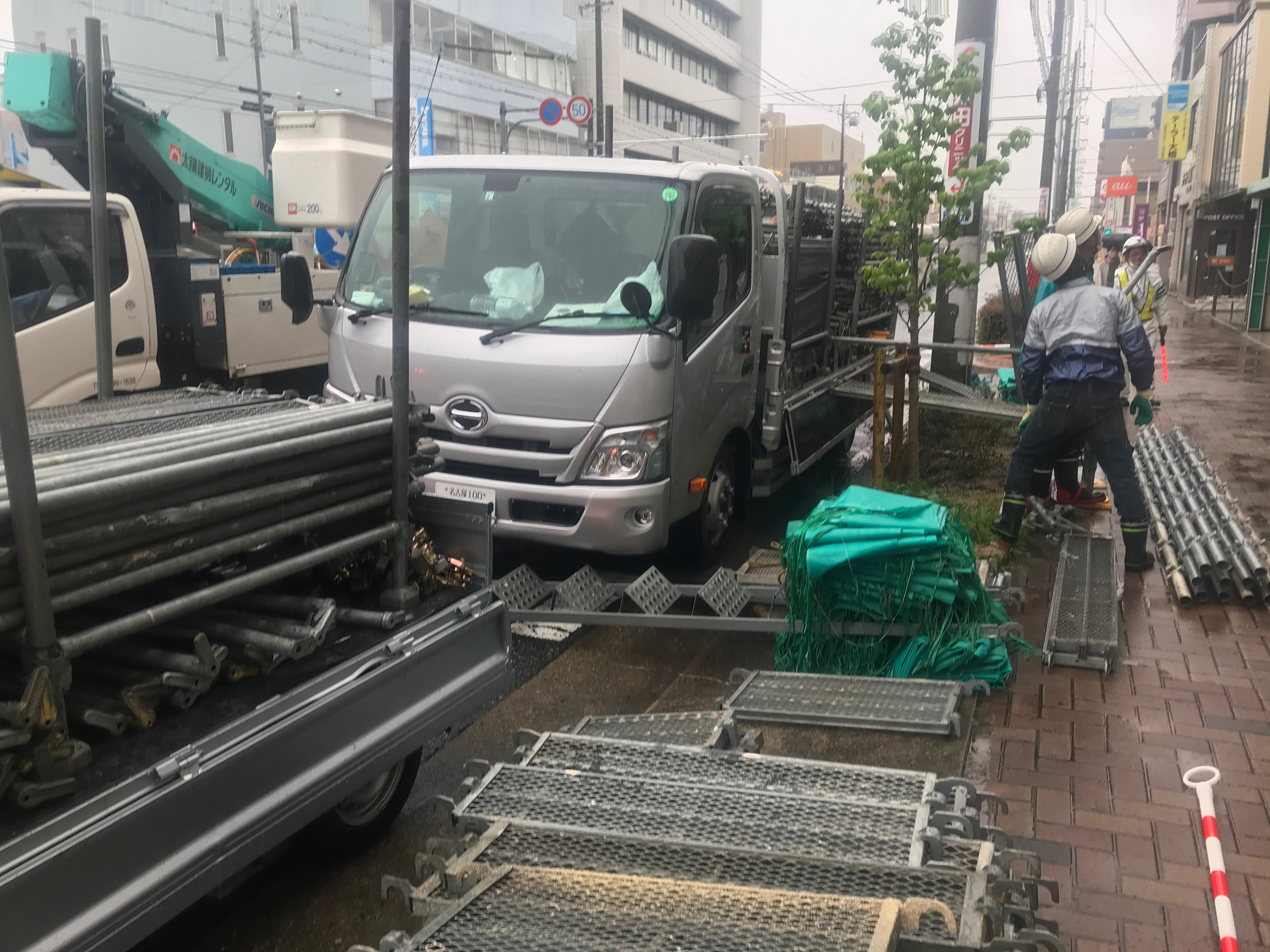 道路占用使用許可の承認をいただき、足場組みと解体の時には警備員を2名配置して歩行者の誘導をお願いしました。