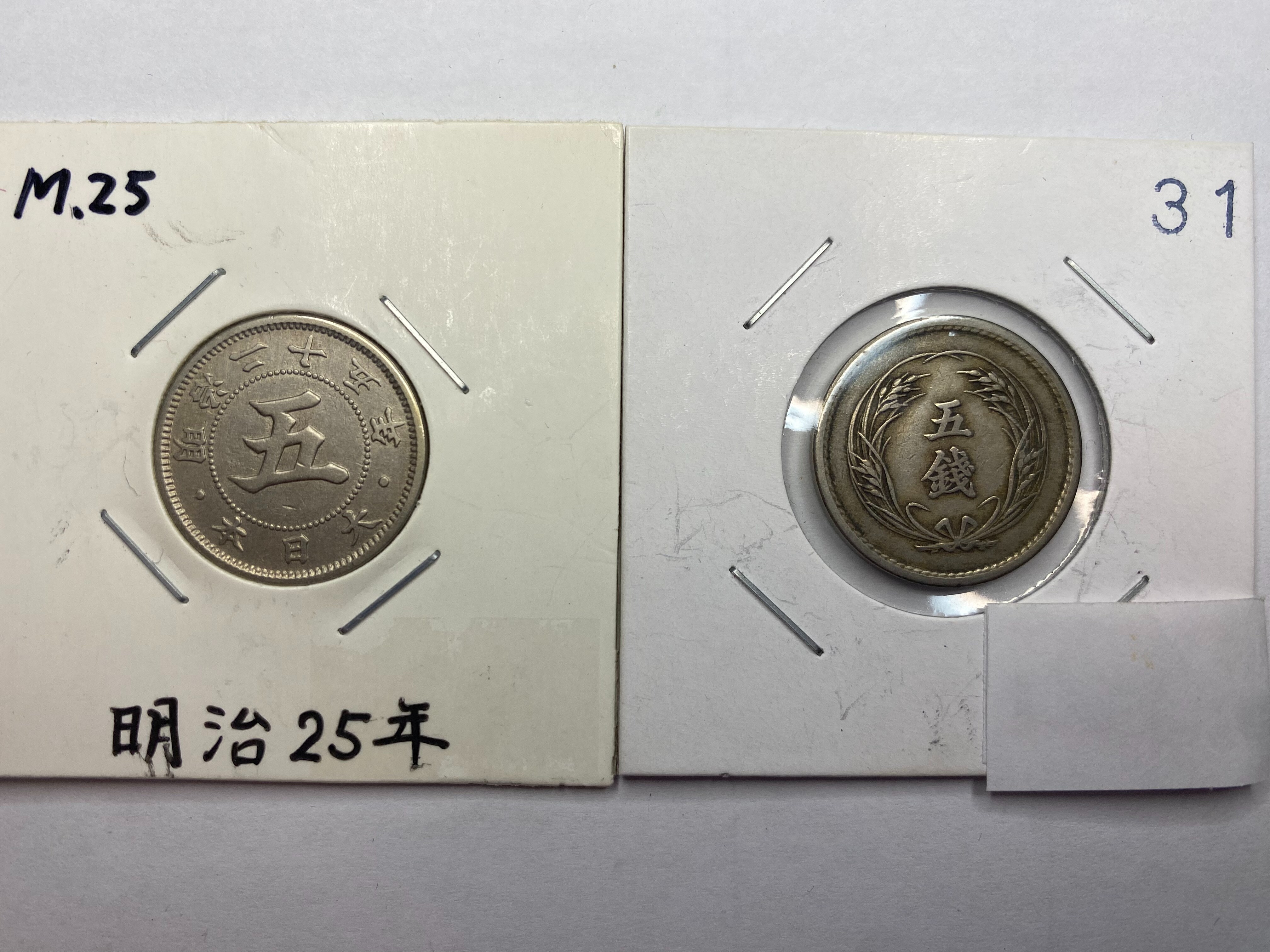 左:菊5銭白銅貨(品位:銅750/ニッケル250) 右:稲5銭白銅貨(品位:銅750/ニッケル250)