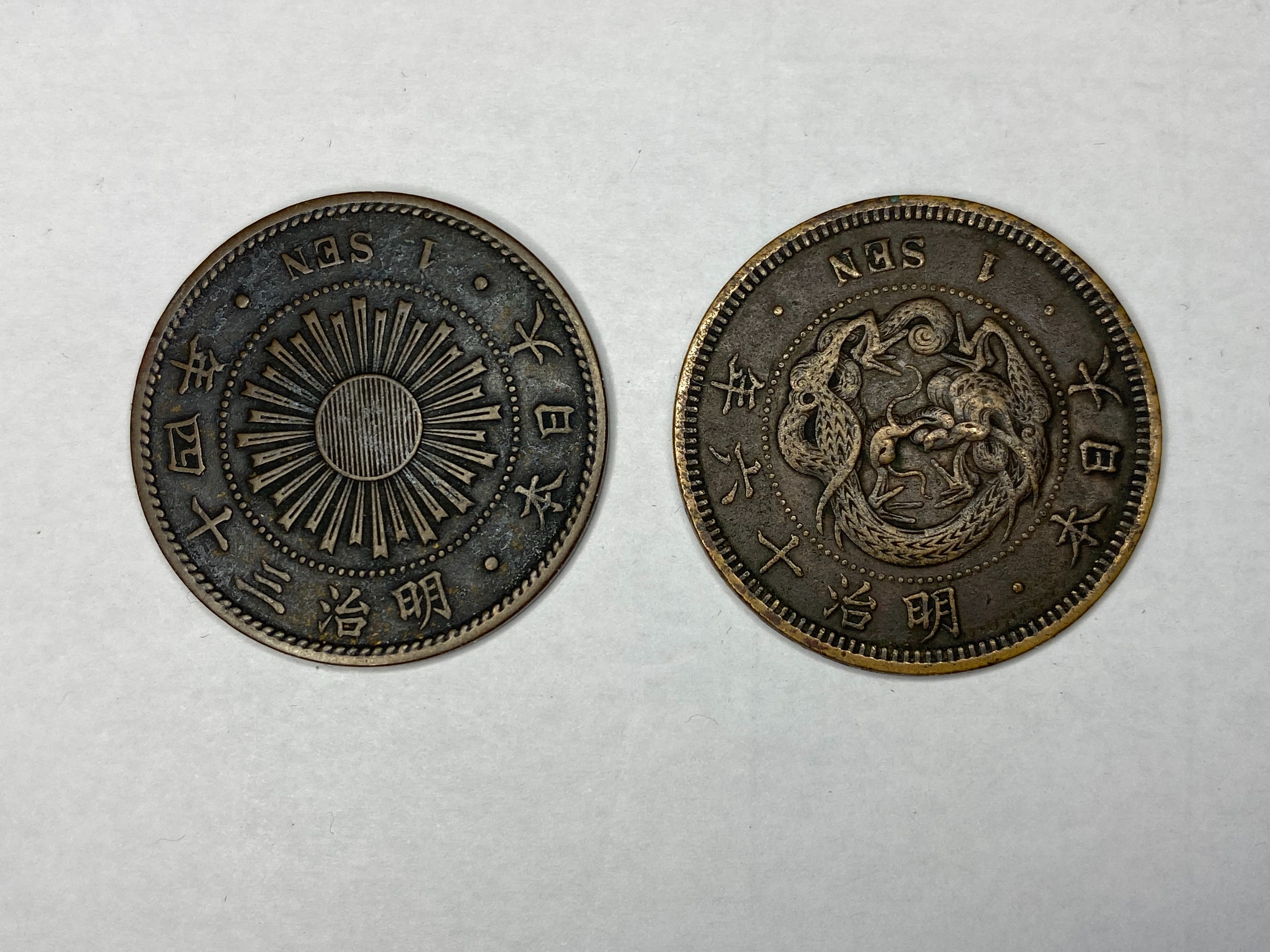 左:稲1銭青銅貨(品位:銅950/錫40/亜鉛10) 右:竜1銭銅貨(品位:銅980/錫10/亜鉛10)