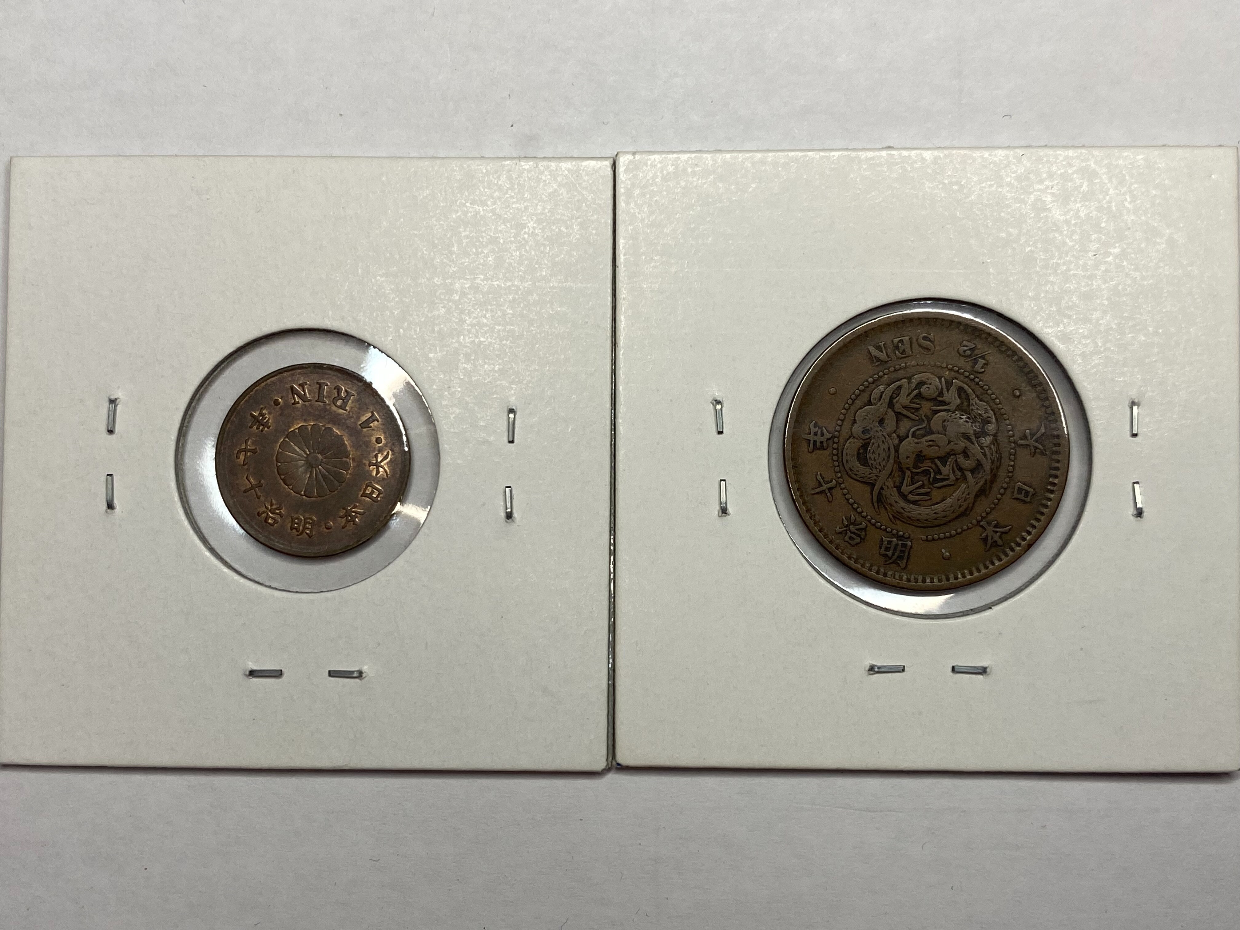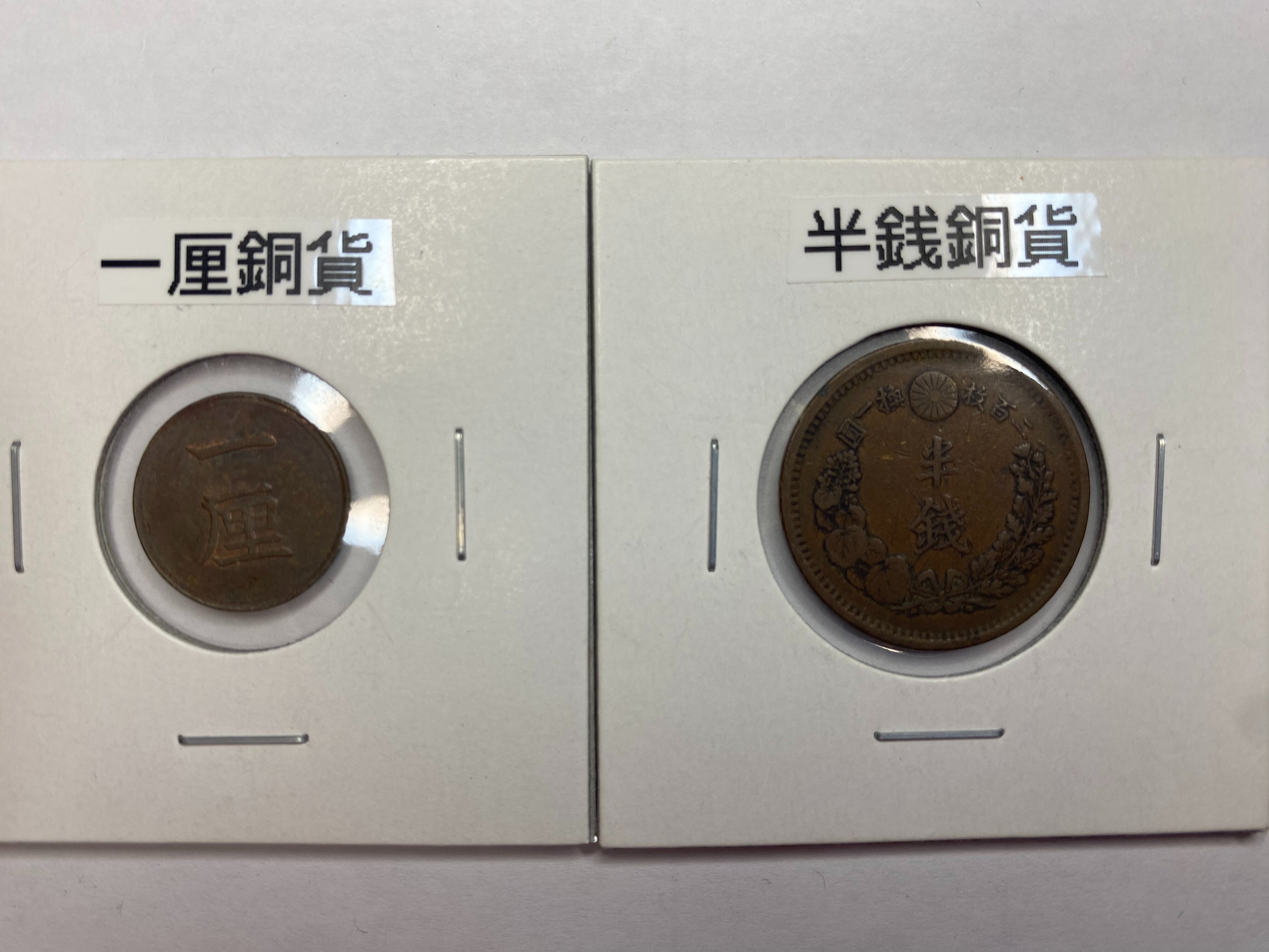 左:1厘銅貨(品位:銅980/錫10/亜鉛10) 右:半銭銅貨(品位:銅980/錫10/亜鉛10)