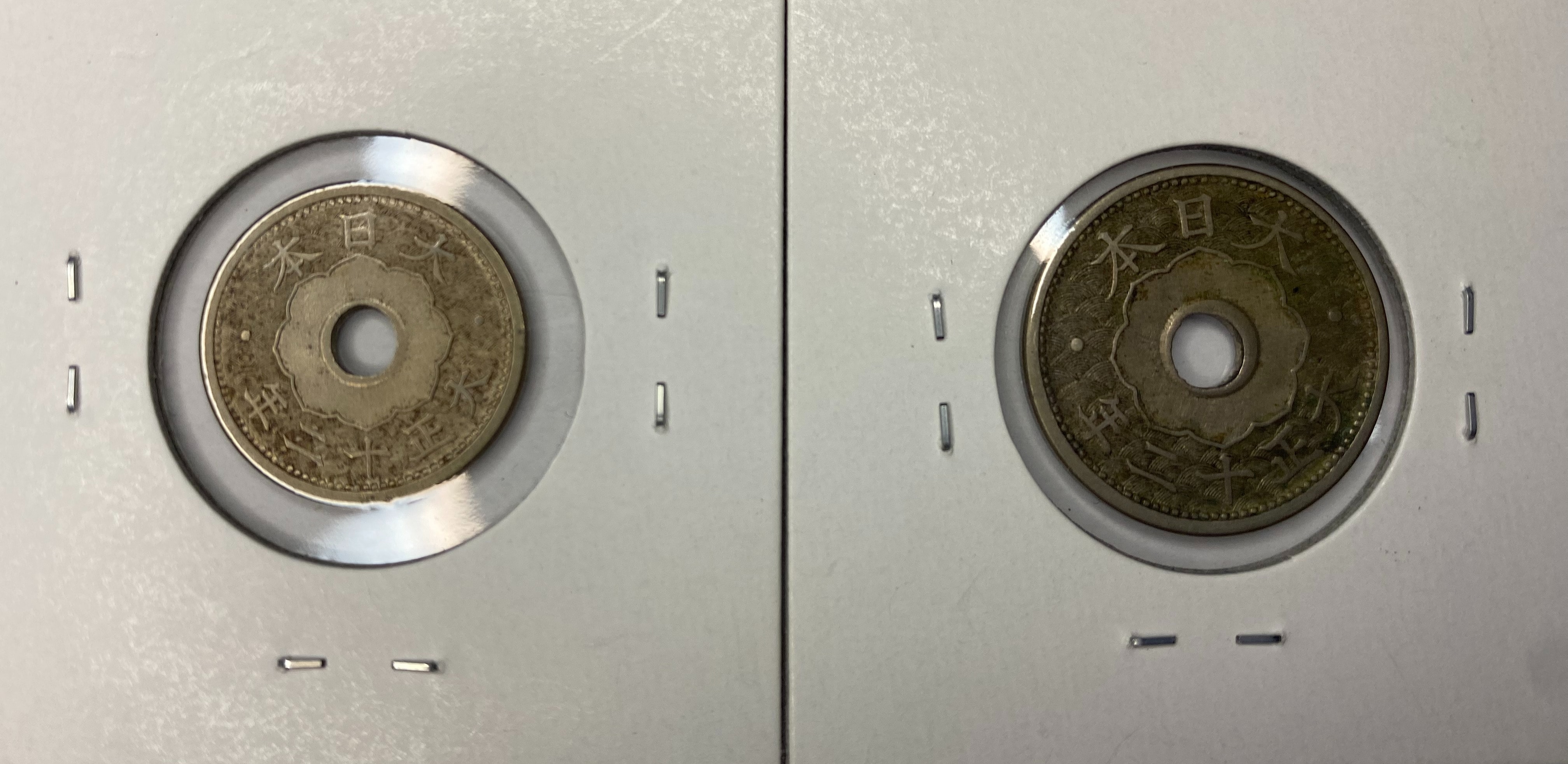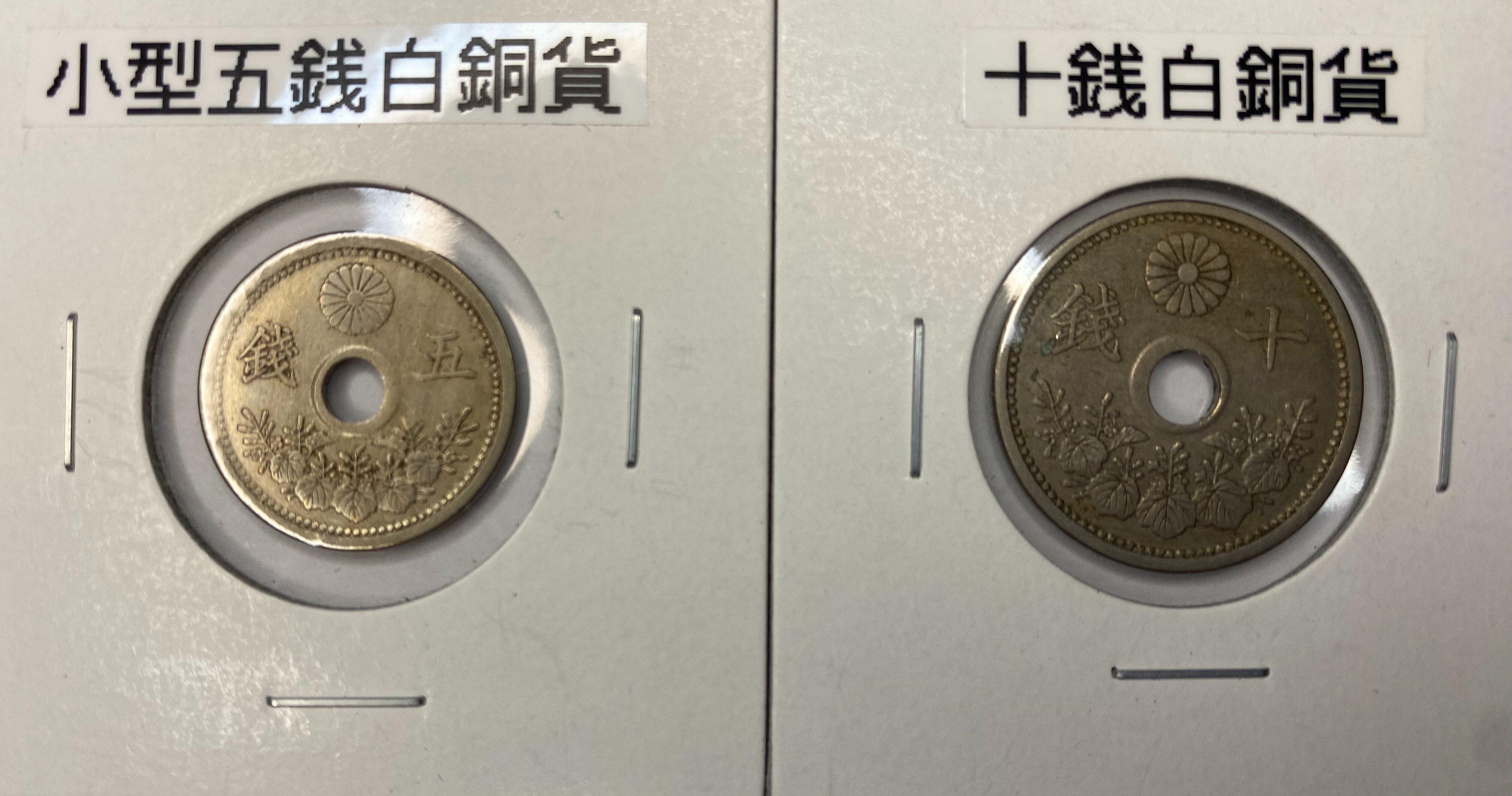 左:小型5銭白銅貨(品位:銅750/ニッケル250) 右:10銭白銅貨(品位:銅750/ニッケル250)