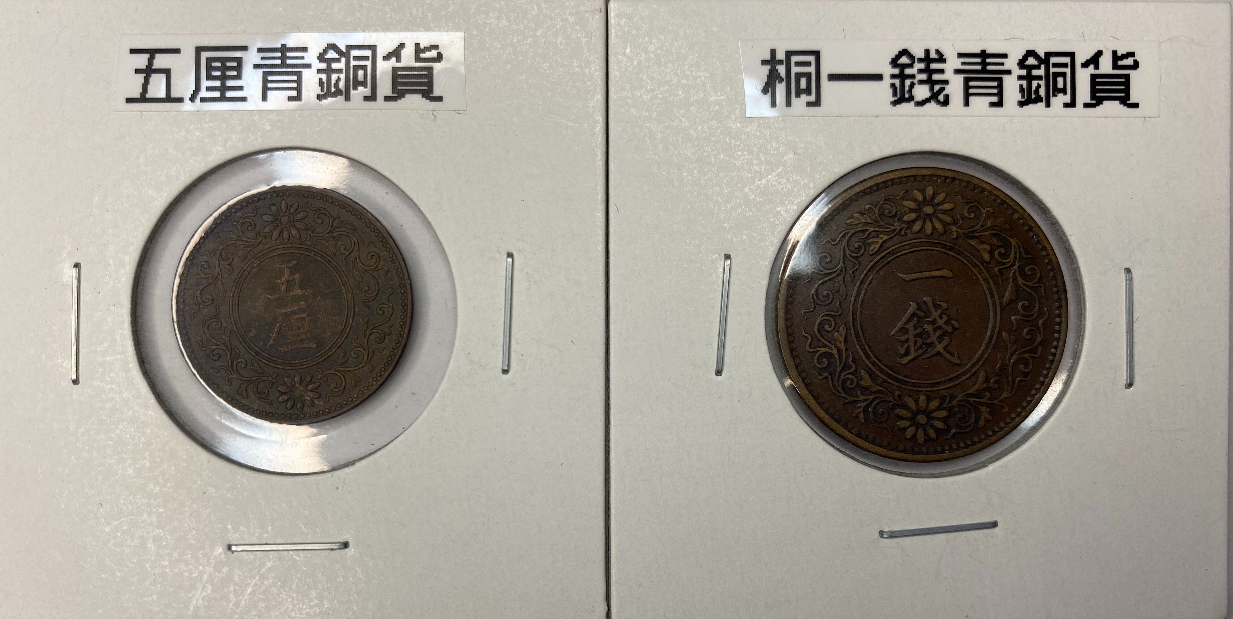 左:5厘青銅貨(品位:銅950/錫40/亜鉛10) 右:桐1銭青銅貨(品位:銅950/錫40/亜鉛10)