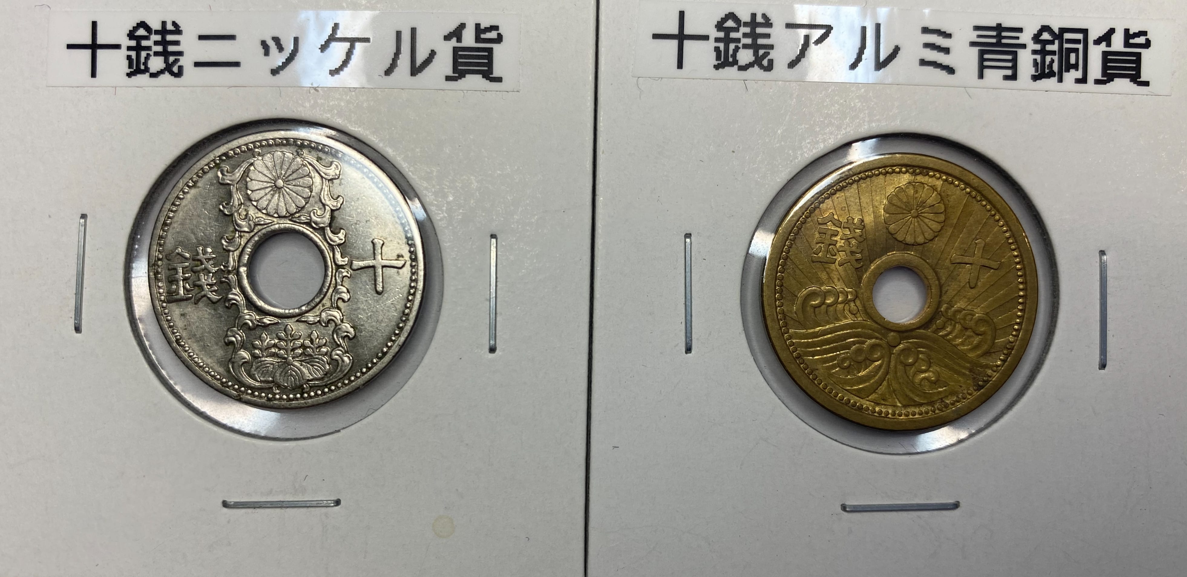左:10銭ニッケル貨(品位:ニッケル1,000) 直径22mm 右:10銭アルミ青銅貨(銅950/アルミ50) 直径22mm